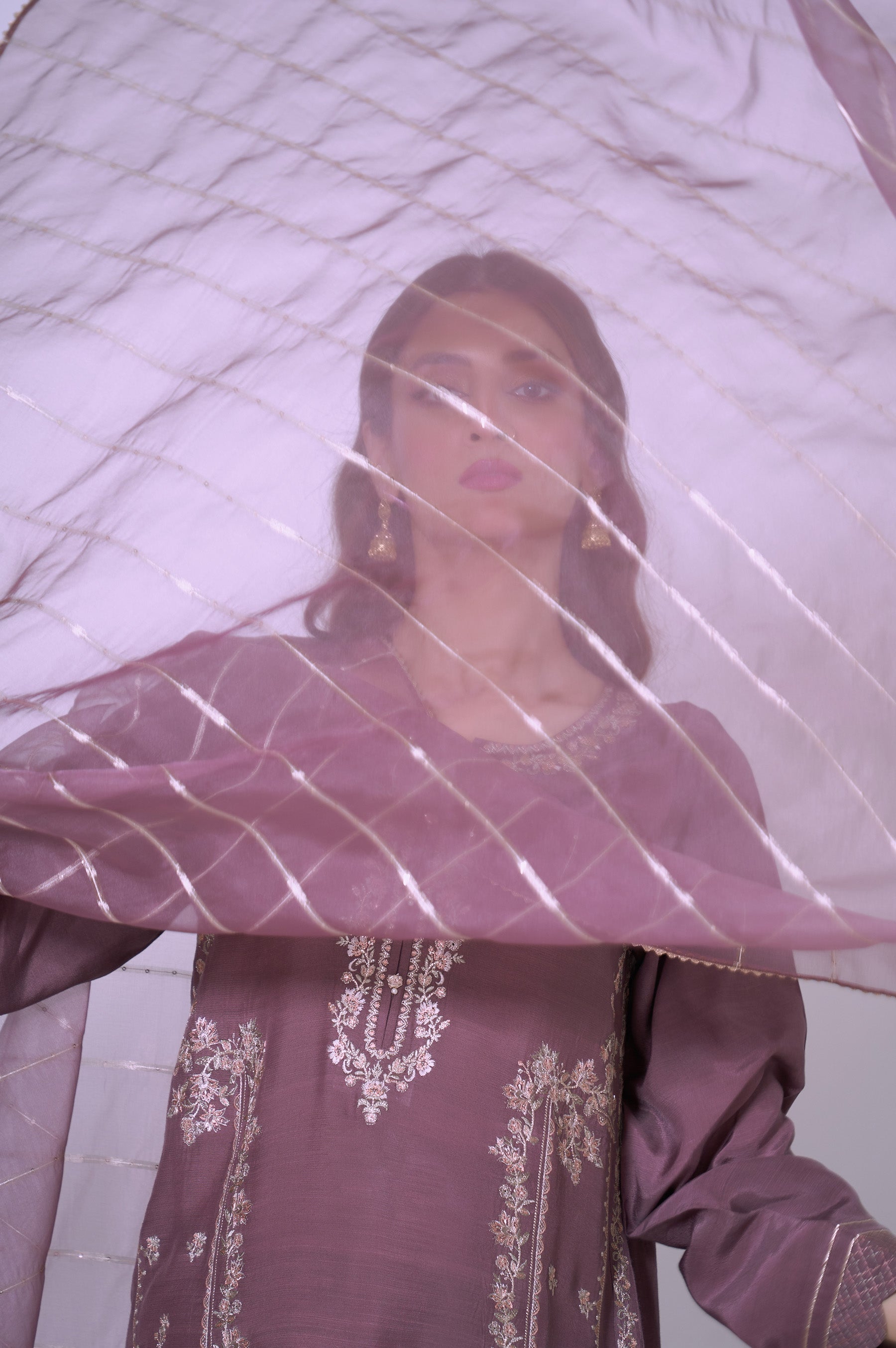 Rendered in a beautiful shade of mauve, this design is pure elegance with its contemporary layout. Floral buds are embroidered all over the shirt in pretty pastel shades enhanced with zari. Intricately embroidered lace border is added to uplift the outfit. It is paired with a sequined zari stripes organza dupatta with heavy embroidered borders and matching rawsilk pants. Add this ensemble to your wardrobe for versatility.
