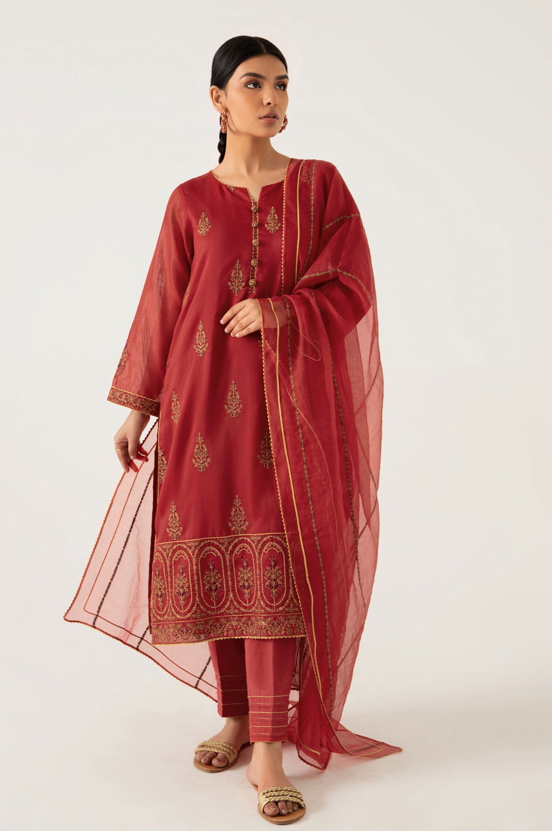 In a gleaming Red hue this 3pcs outfit features an aesthetically rich composition layered over cotton net shirt enriched with traditional floral embroidery.Portraying a majestic composition in orange and purple hues and a blend of gold accents,this ensemble is paired with a classic and a meticulously embroidered cotton net dupatta to add grace at festive occassions.