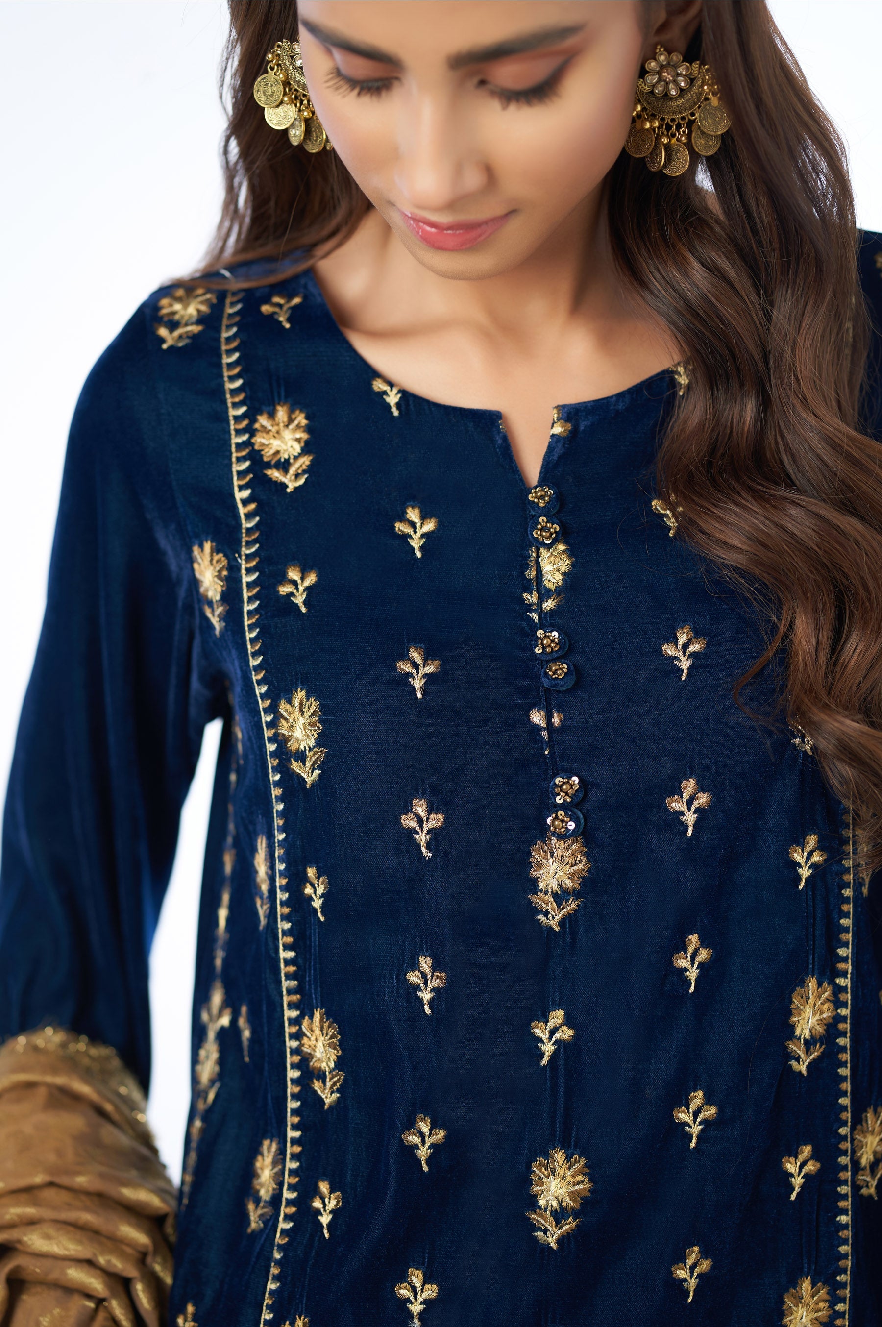 This teal blue velvet shirt features intricately detailed zari embroidery in shades of gold using floral motifs. It is paired with a banarsi dupatta with heavy detailed borders and all over jaal. Rawsilk matching pants are added to complete the look.