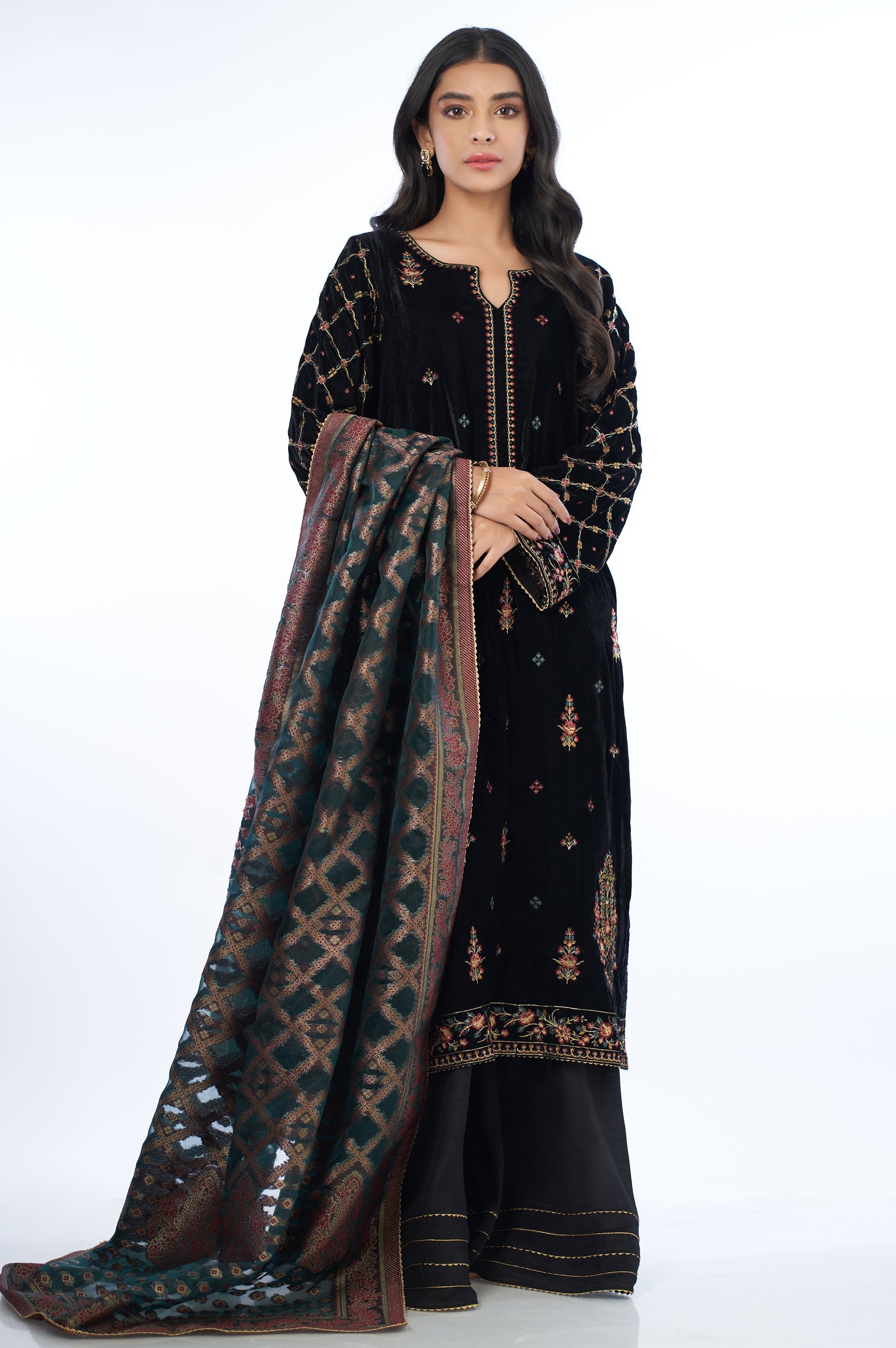This 3pcs unstitched black velvet canvas is set off with flawless embroidery, portraying a mesmerizing hue of maroon and green with gold thread work. This design is complemented by a detailed border, and sleeves with dainty elements beaming with gold thread. Paired with green organza jacquard dupatta and raw silk bottom, this makes a look that is truly captivating.