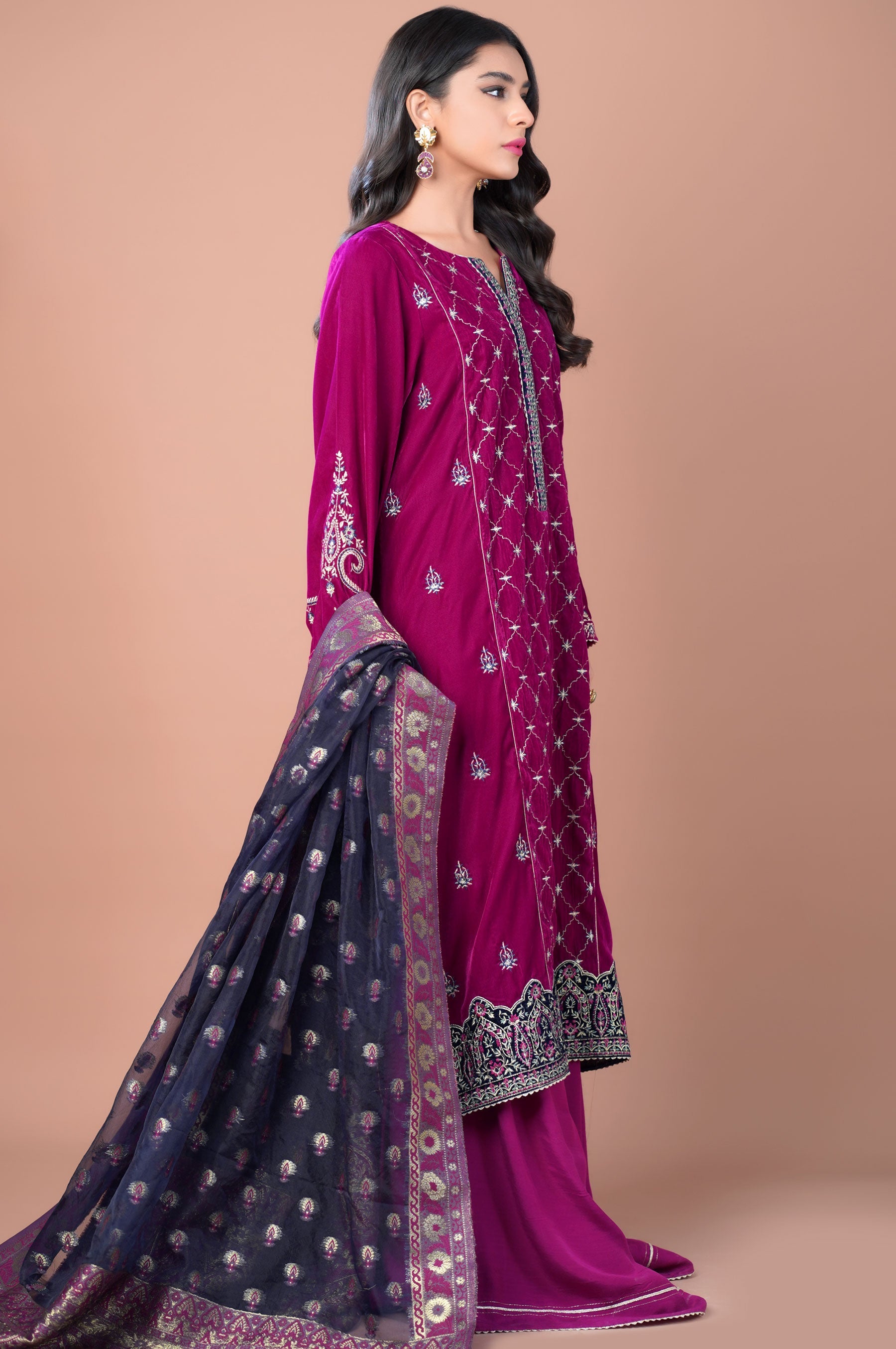This unstitched three piece velvet outfit is rendered in an eye catching contrast of fuchsia and navy blue featuring delicate floral motifs and self patterned embroidery in zari. It is paired with a heavy organza jacquard dupatta and rawsilk pants to give it a formal look.