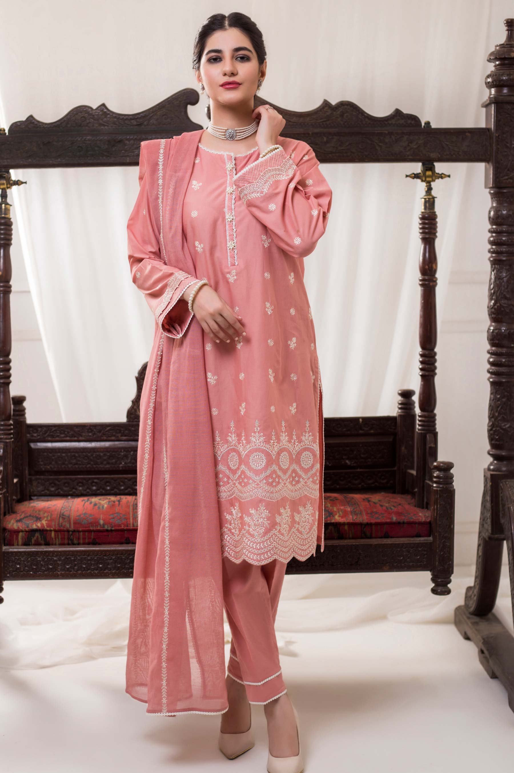 Rendered in blush pink shade, this cambric shirt features intricate chikankari embroidery in floral design with scallop borders at front and sleeves. Completing the sophisticated look with embroidered khadinet dupatta and tonal cambric bottom, this ensemble is perfect for day and evening affairs this summer seasons.