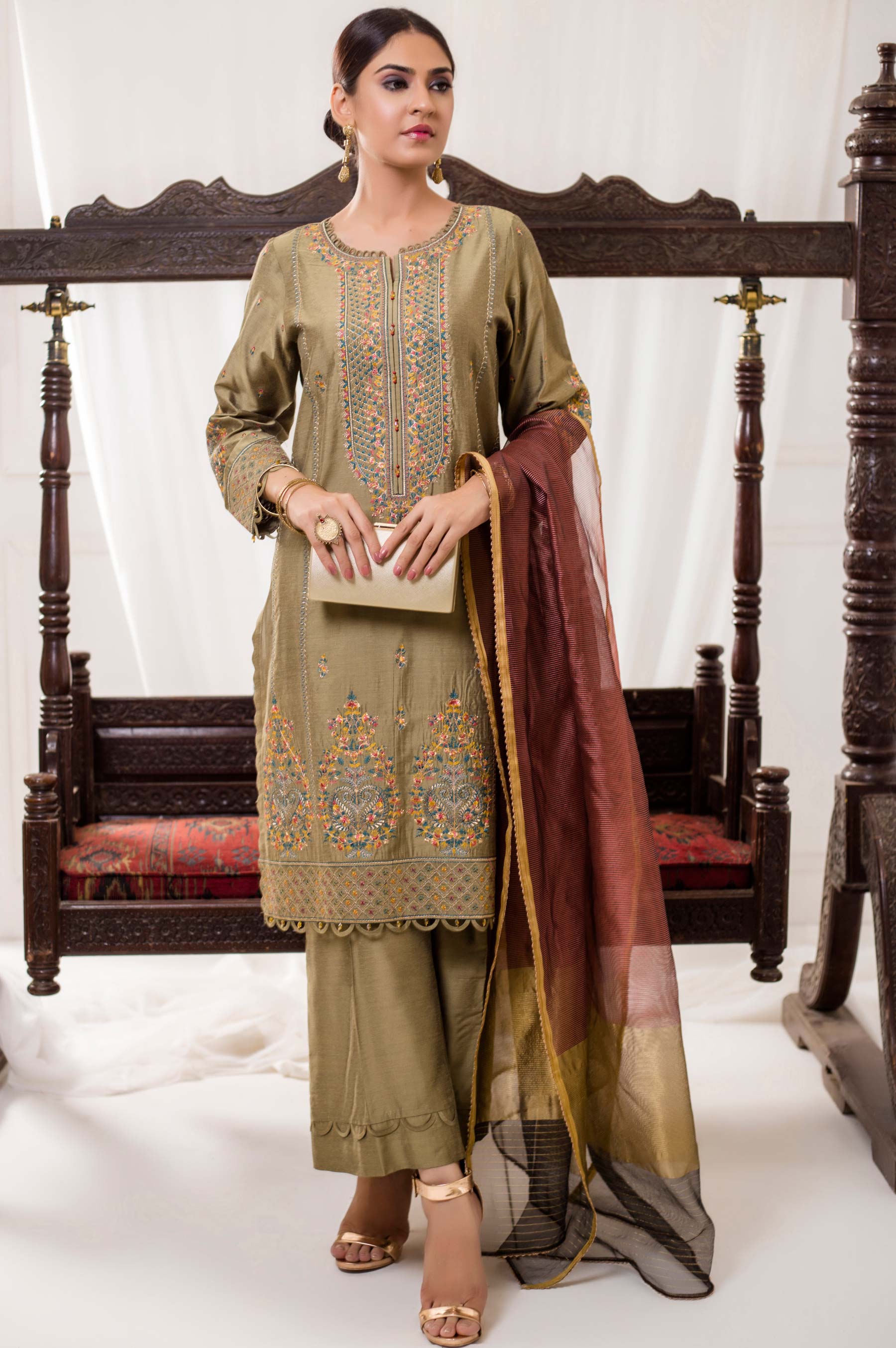 A traditional design in classic layout adorned with beautifully composed embroidery in hues of mustard, blue and pink. It comes with a gorgeous contrast dupatta and cotton silk pant. This design can be styled in numerous ways to suit your eastern occasions.