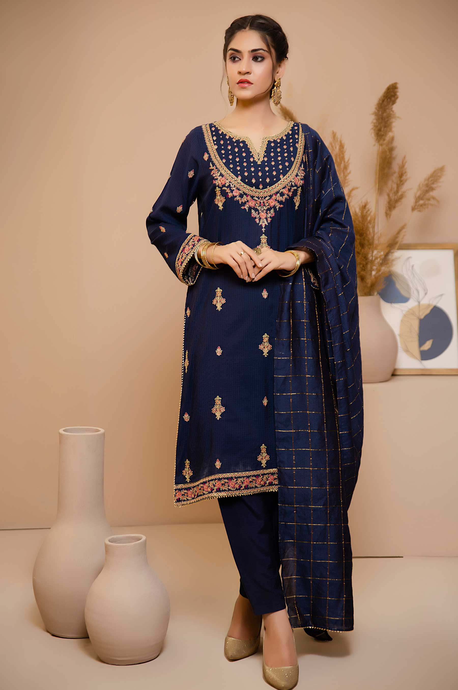 A perfect balance of tradition with modernity; This Prussian blue with resham and dori embroidery will complete the look. Paired with matching raw silk bottom and checkered dupatta.