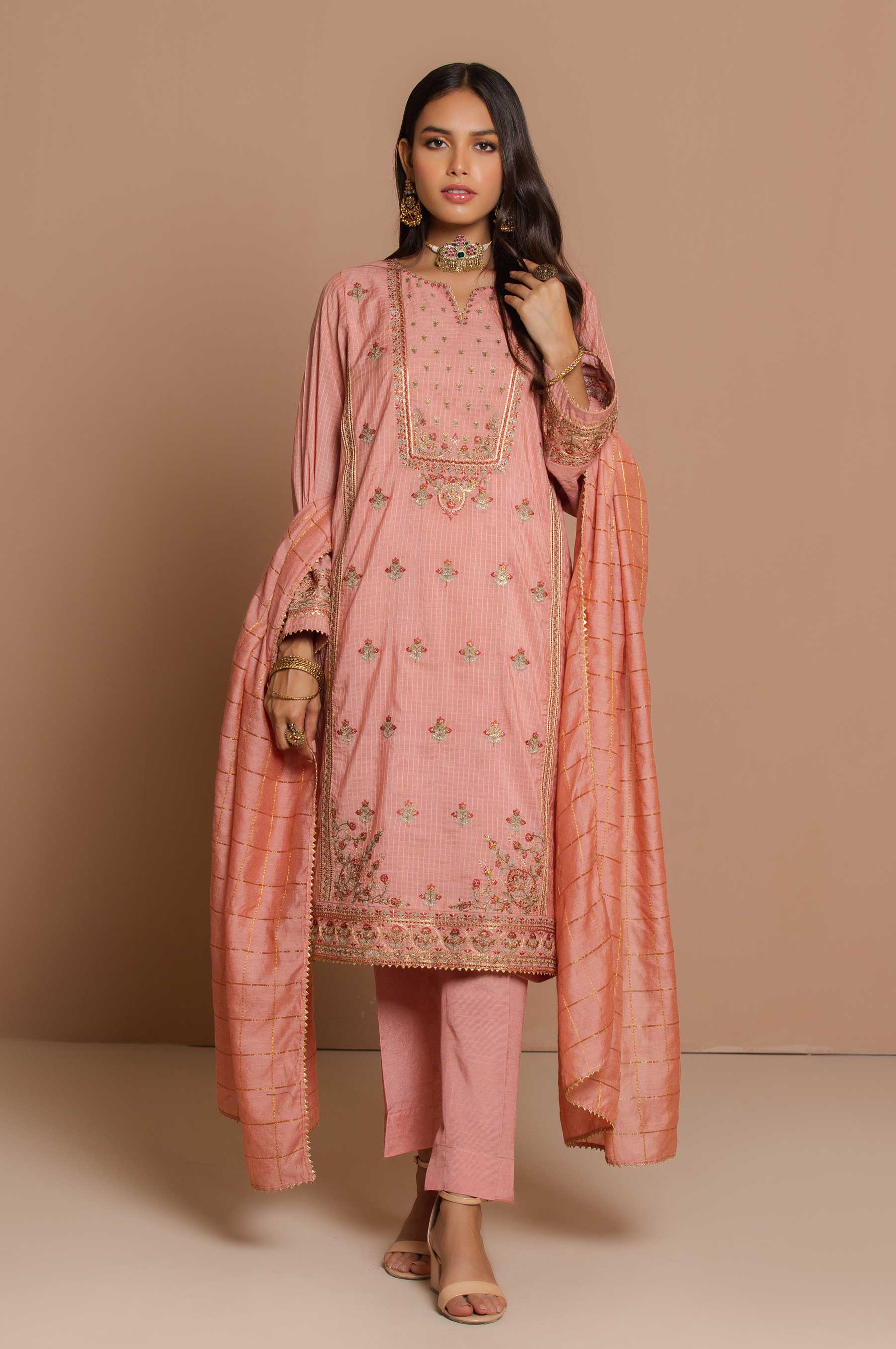 A divine three piece outfit in Camille pink and artfully embroidered with zari checkered dupatta and raw silk trouser brilliantly catching the light in this festive season.