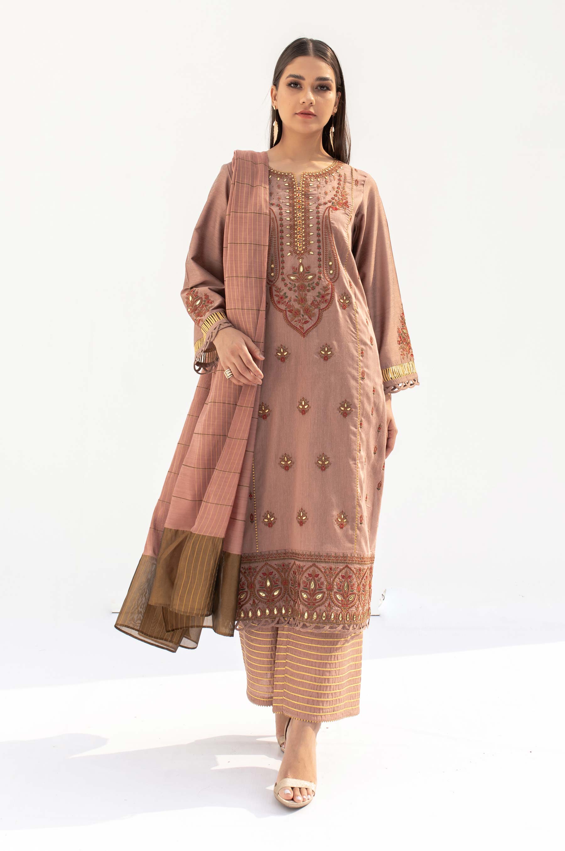In an appealing rose pink color, this gorgeous ensemble enriched with traditional embroidery and enhance with foil embroidery on all over shirt.