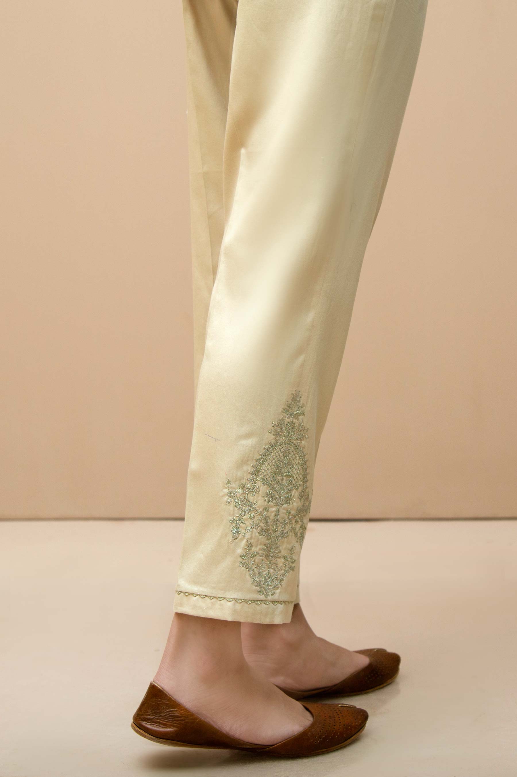 Side motif embroidered on cigrette pant. Kingri lace on hemline.