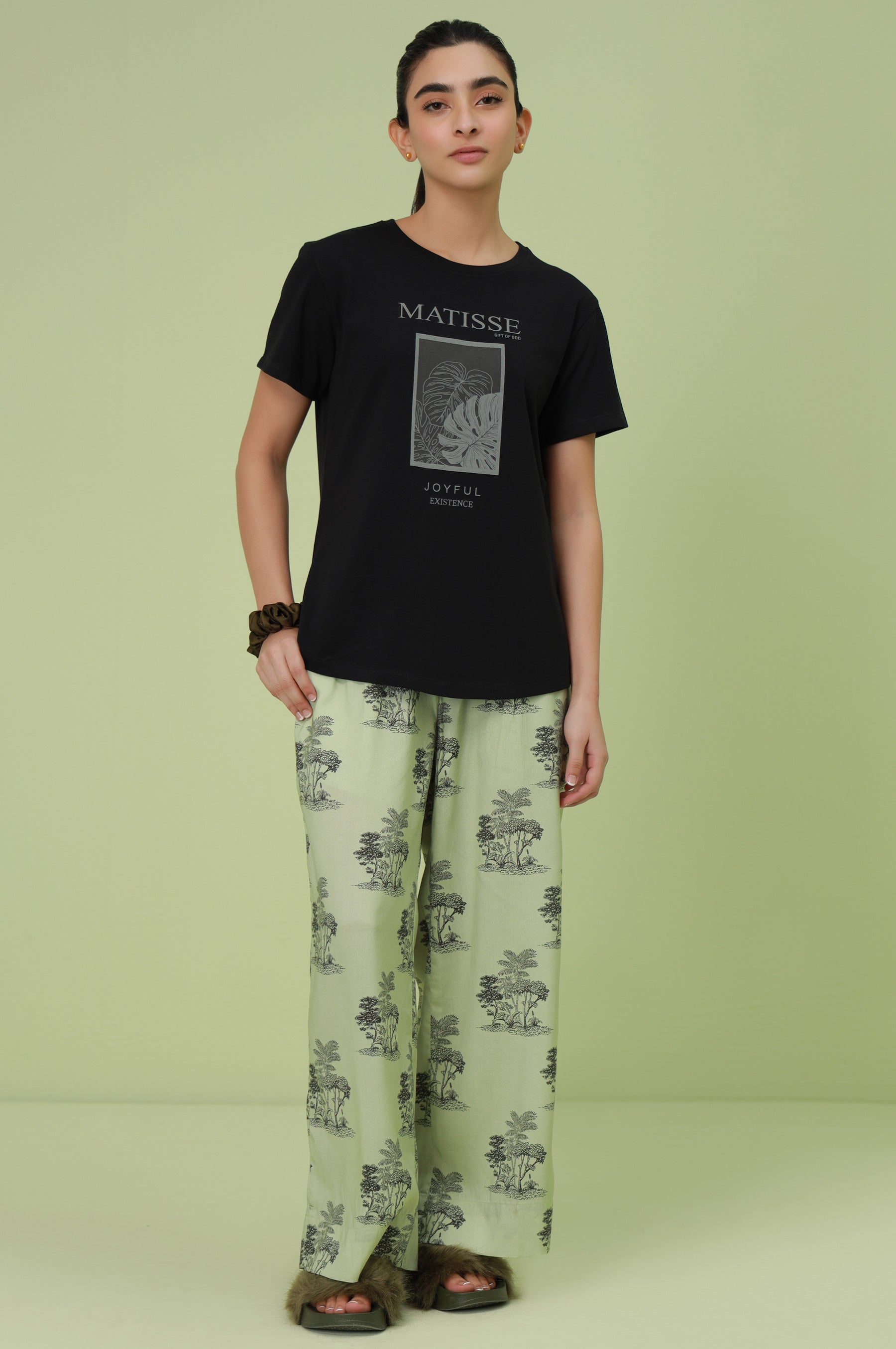 Elevate your casual look with this printed black crew neck shirt. It features half sleeves and a regular length, making it the perfect choice for comfortable loungewear.