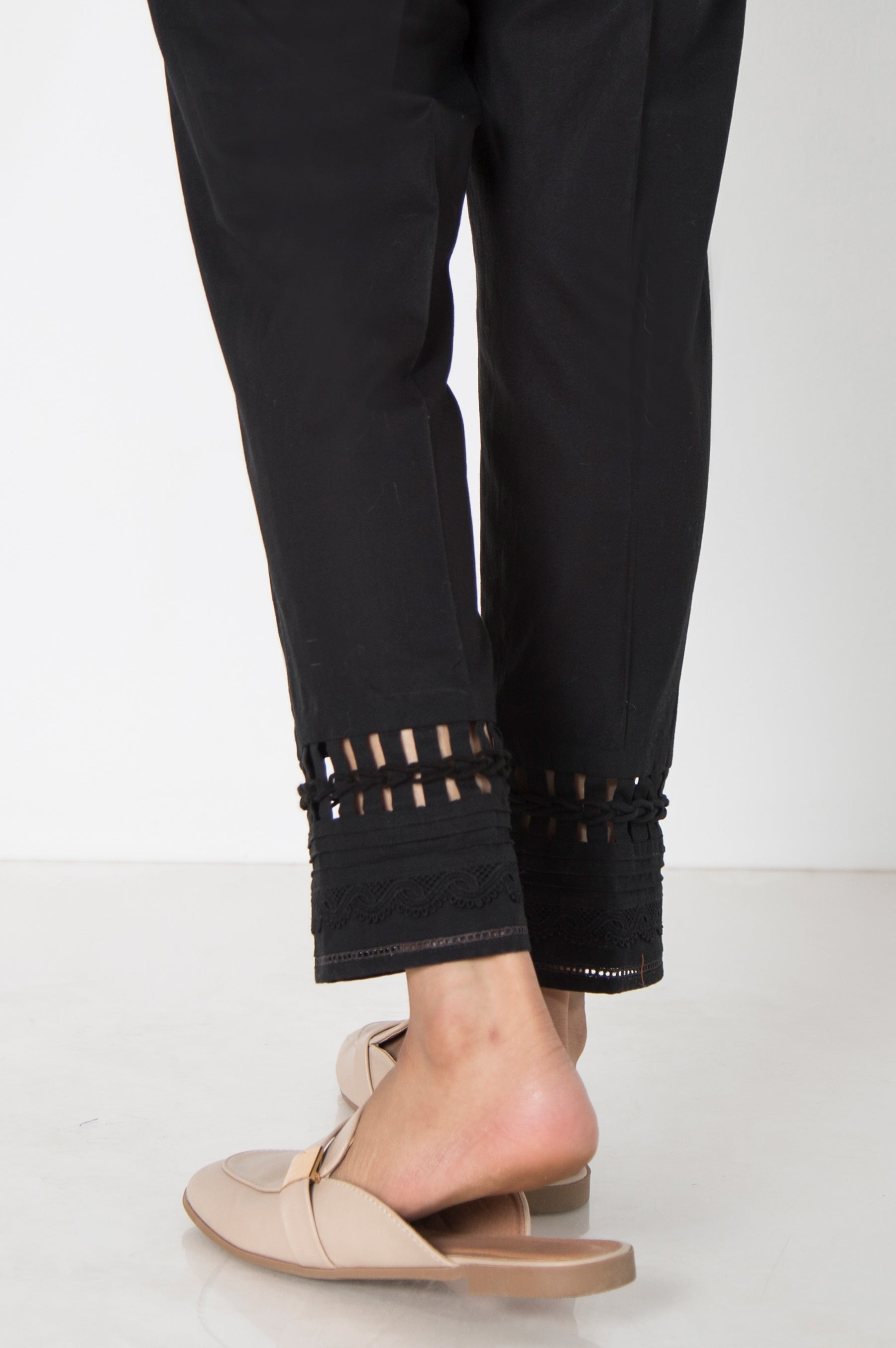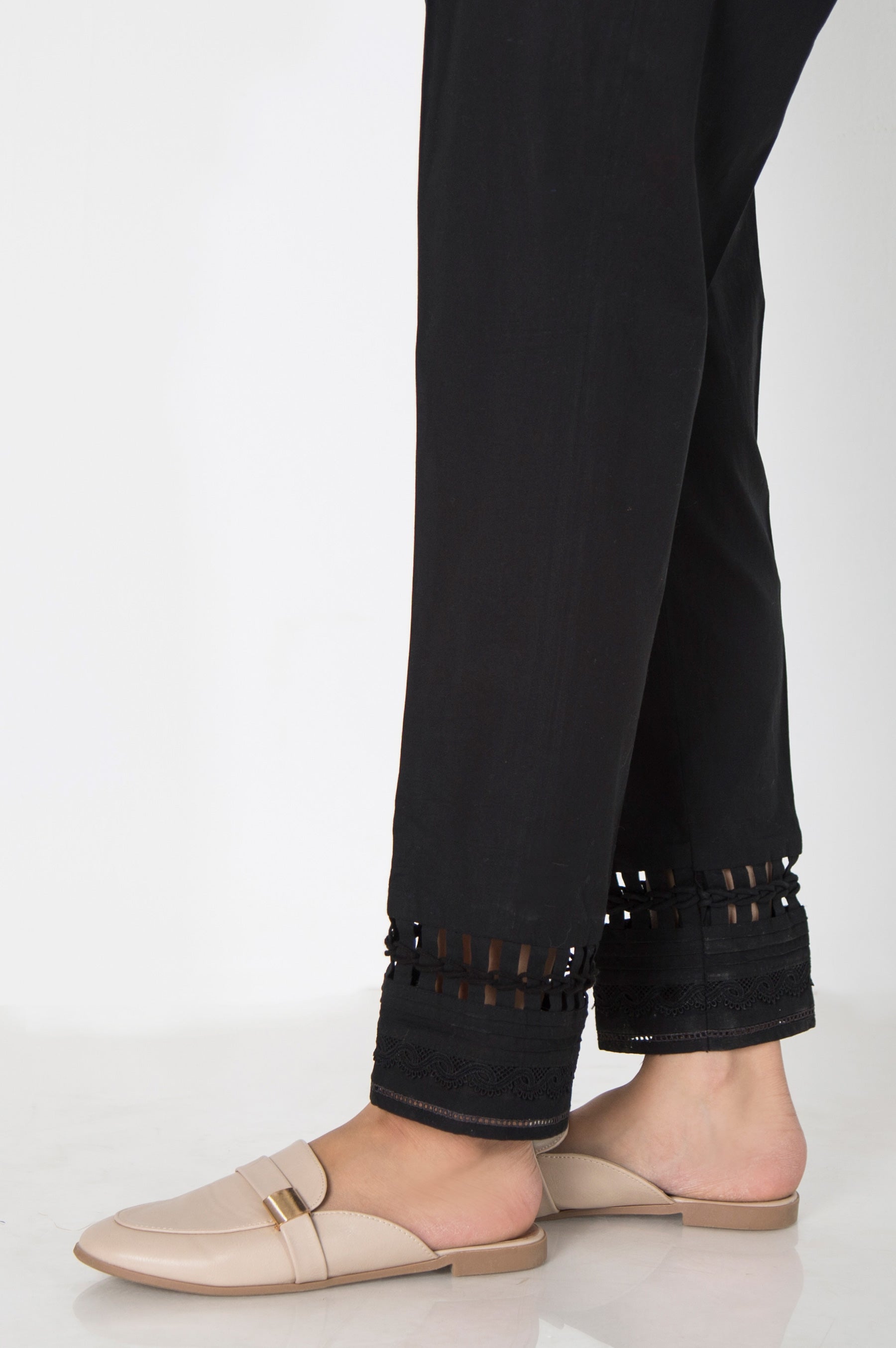 This Cambric Cigarette Pant with fabric manupulation And Lace detailing along with pleats is Perfect for your wardrobe.
