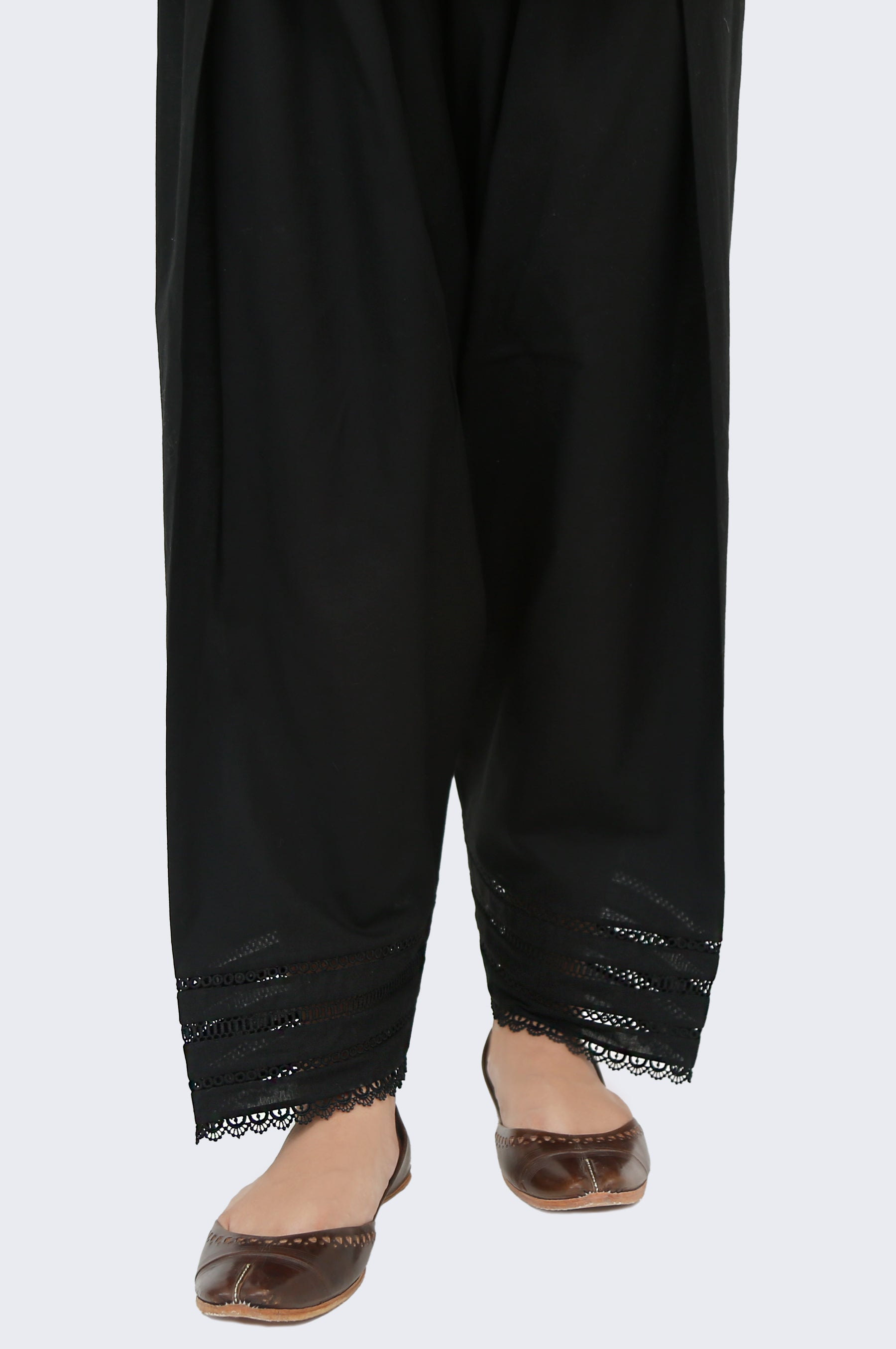 Statement shalwars are in! Add some fun with these black shalwar featuring beautiful lace detailing at the bottom hem.
