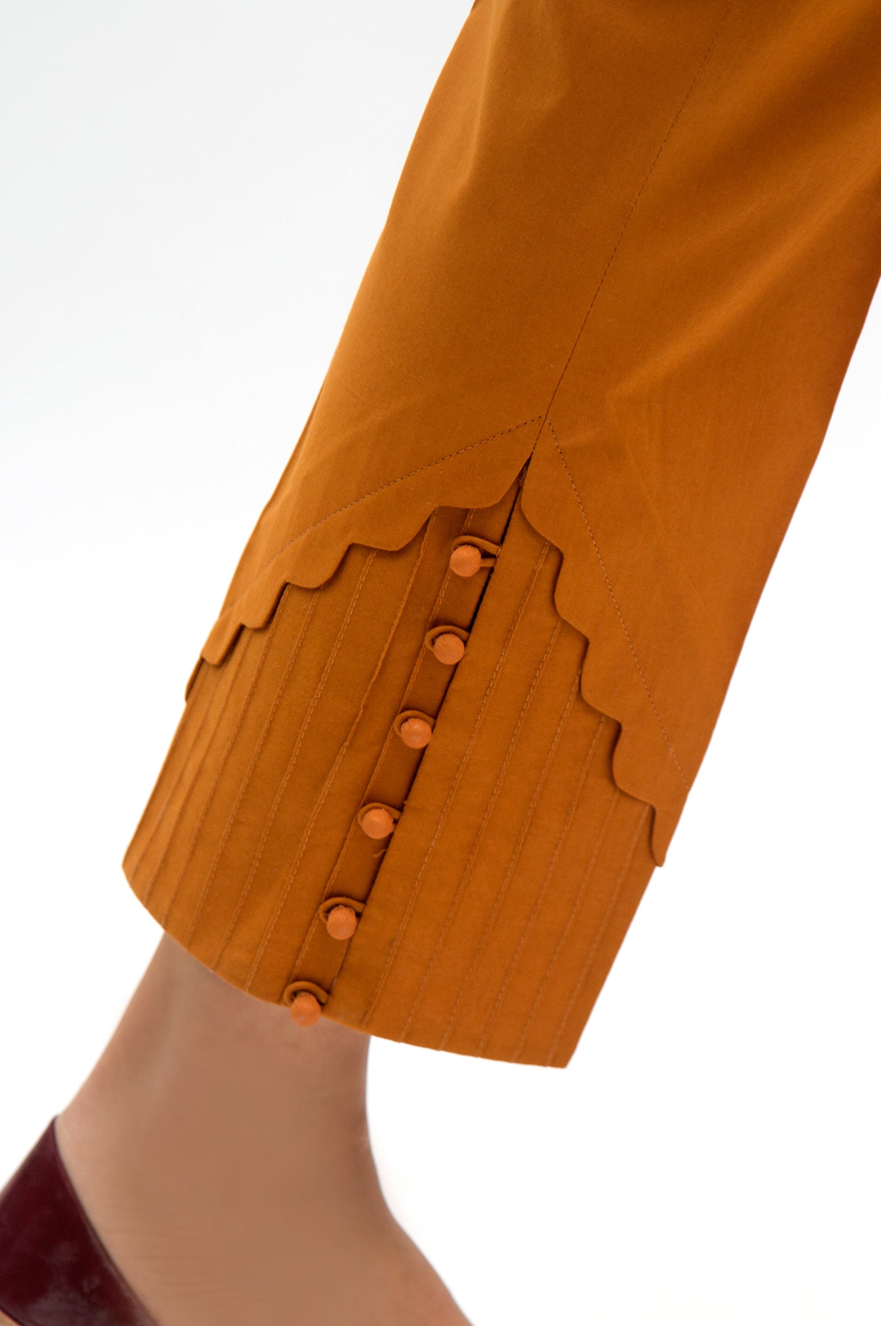 Embellished pants stylized with pintex, scallops and loop buttons.