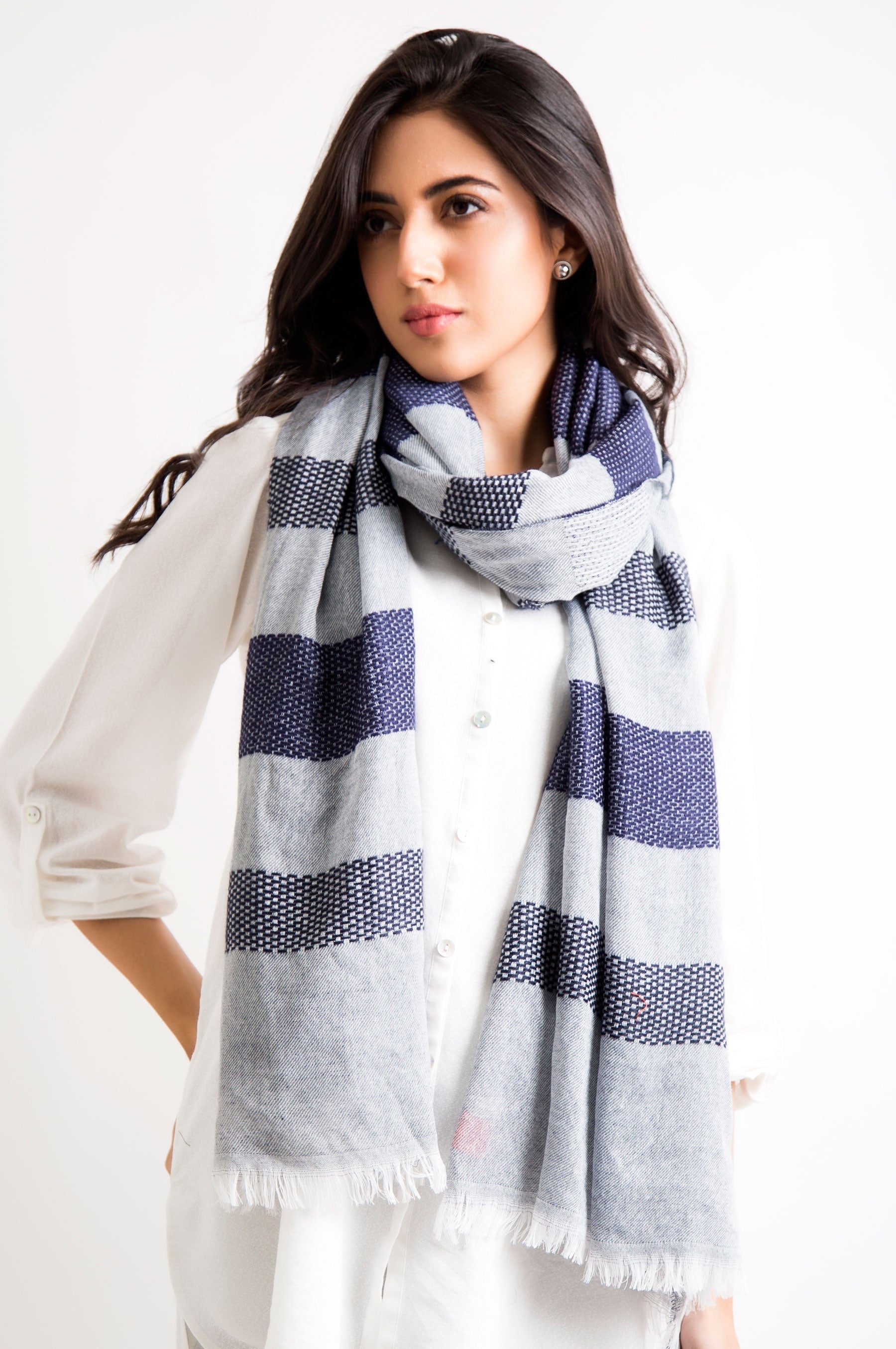 Extremely soft and warm at the same time, this woven shawl in dual tones and fringes makes for an elegant top-off for your winter looks.