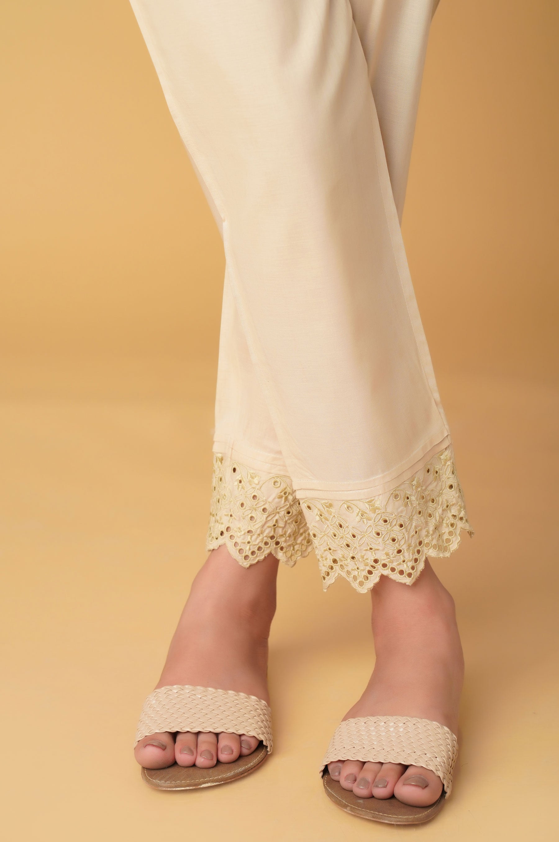 This contemporary pant beautifully rendered in beige with geometrical elements.