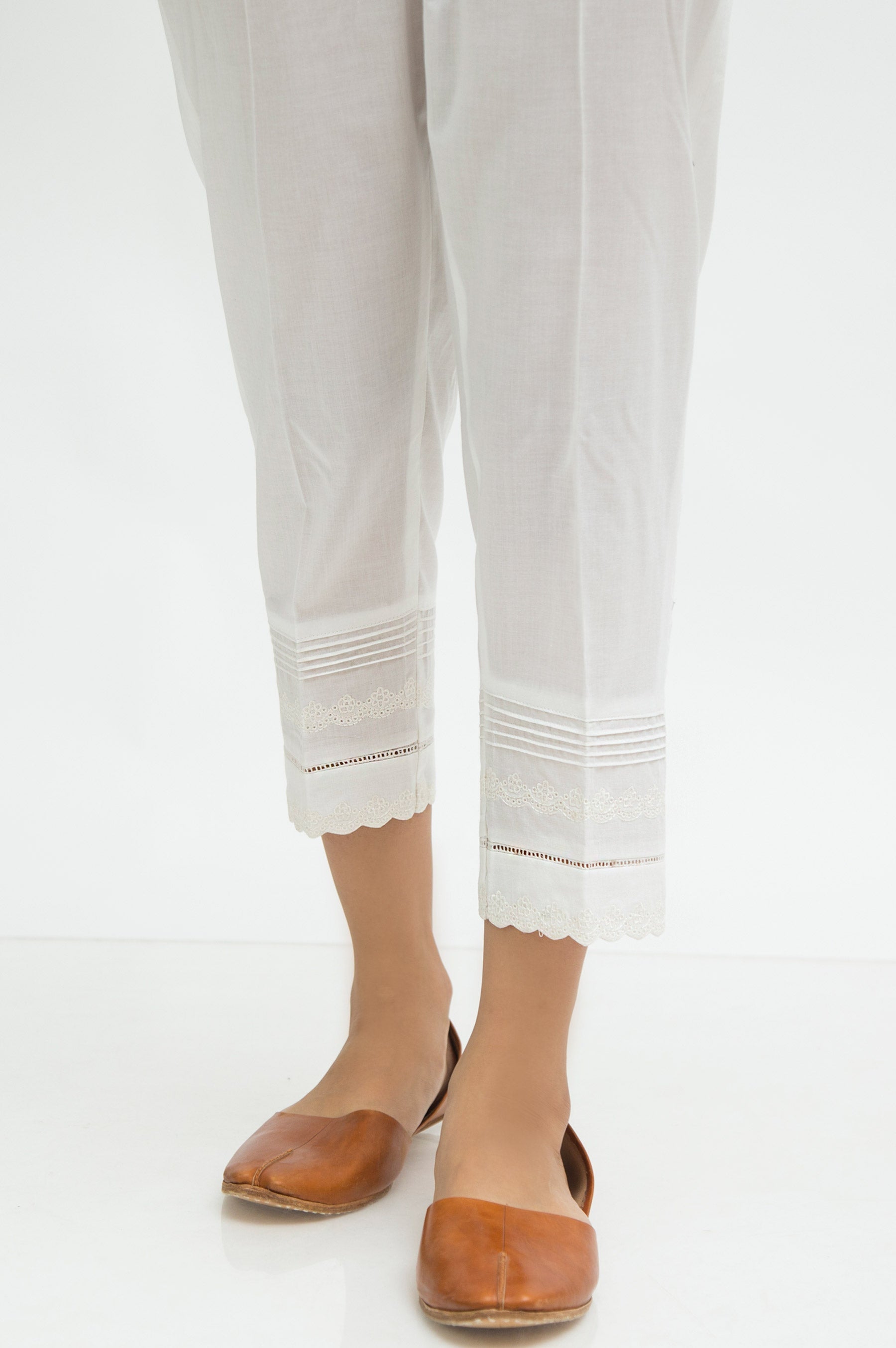 This embroidered cambric capri pants, has combination of lace inspired embroidery and pin tucks.