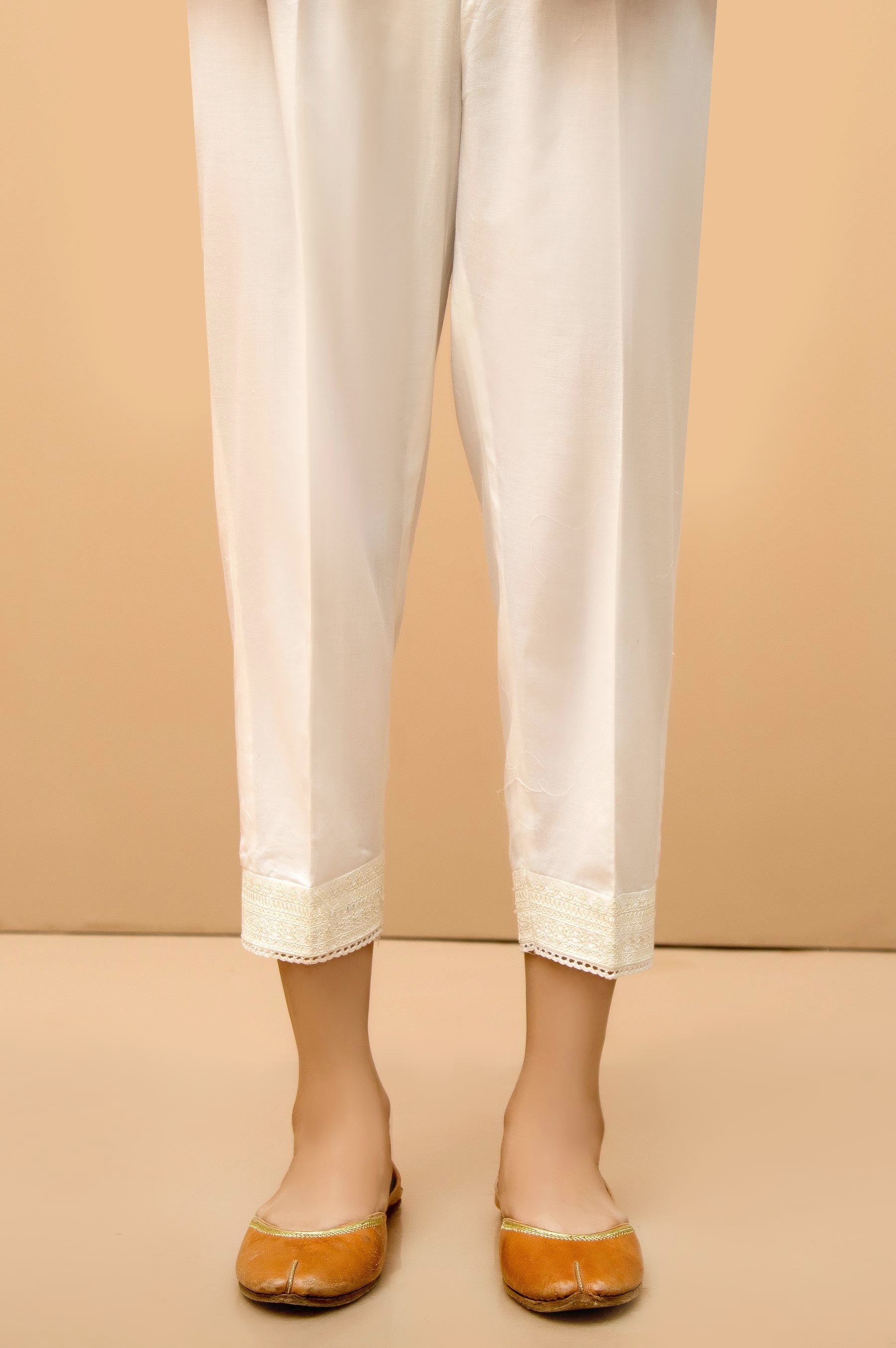 Cambric Capri pants with embroidered bottom embellished with lace.