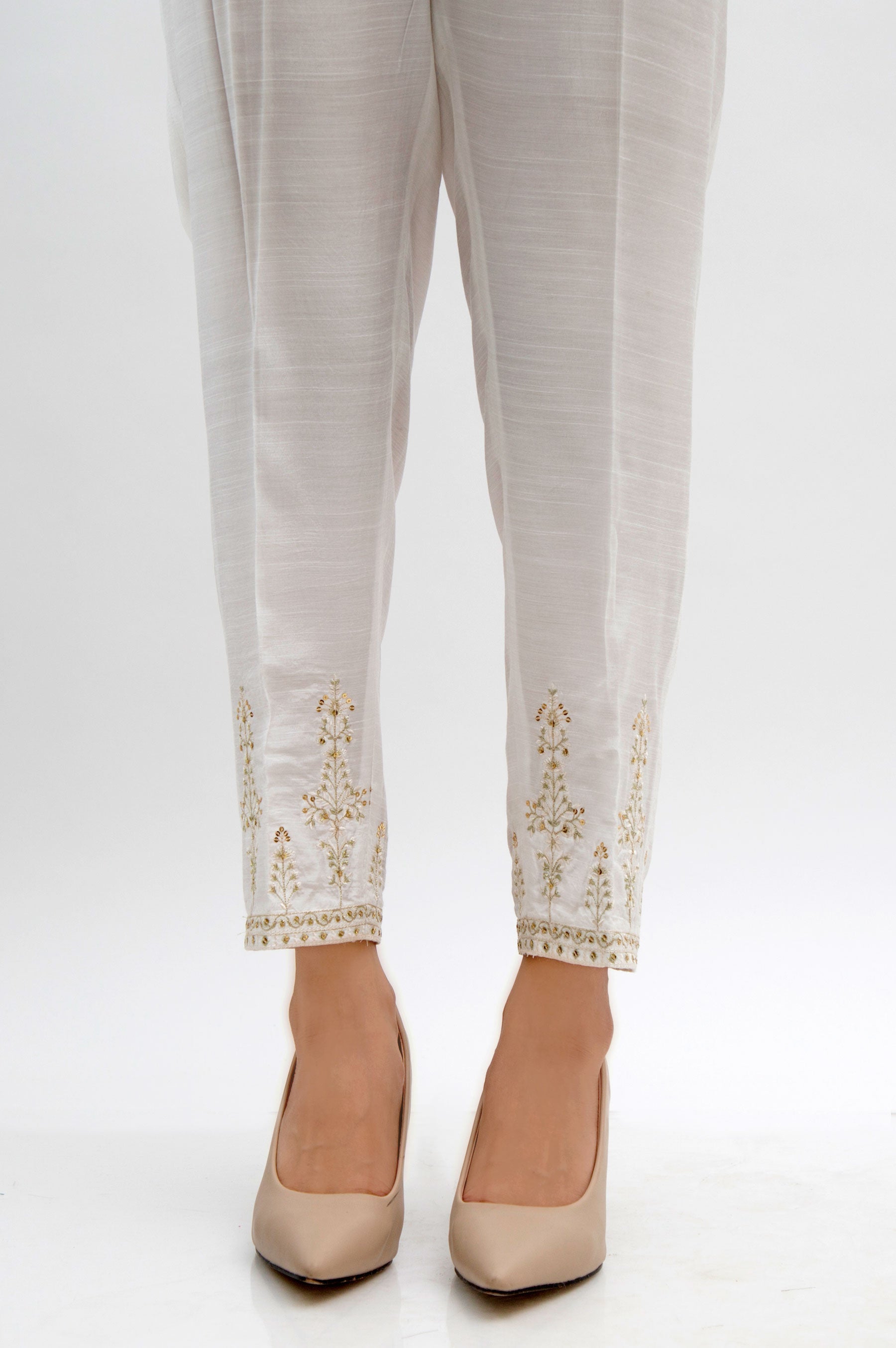 White Raw Silk Cigarette pants with delicate zari and sequence embroidery, works well with Zeen's formal shirt.