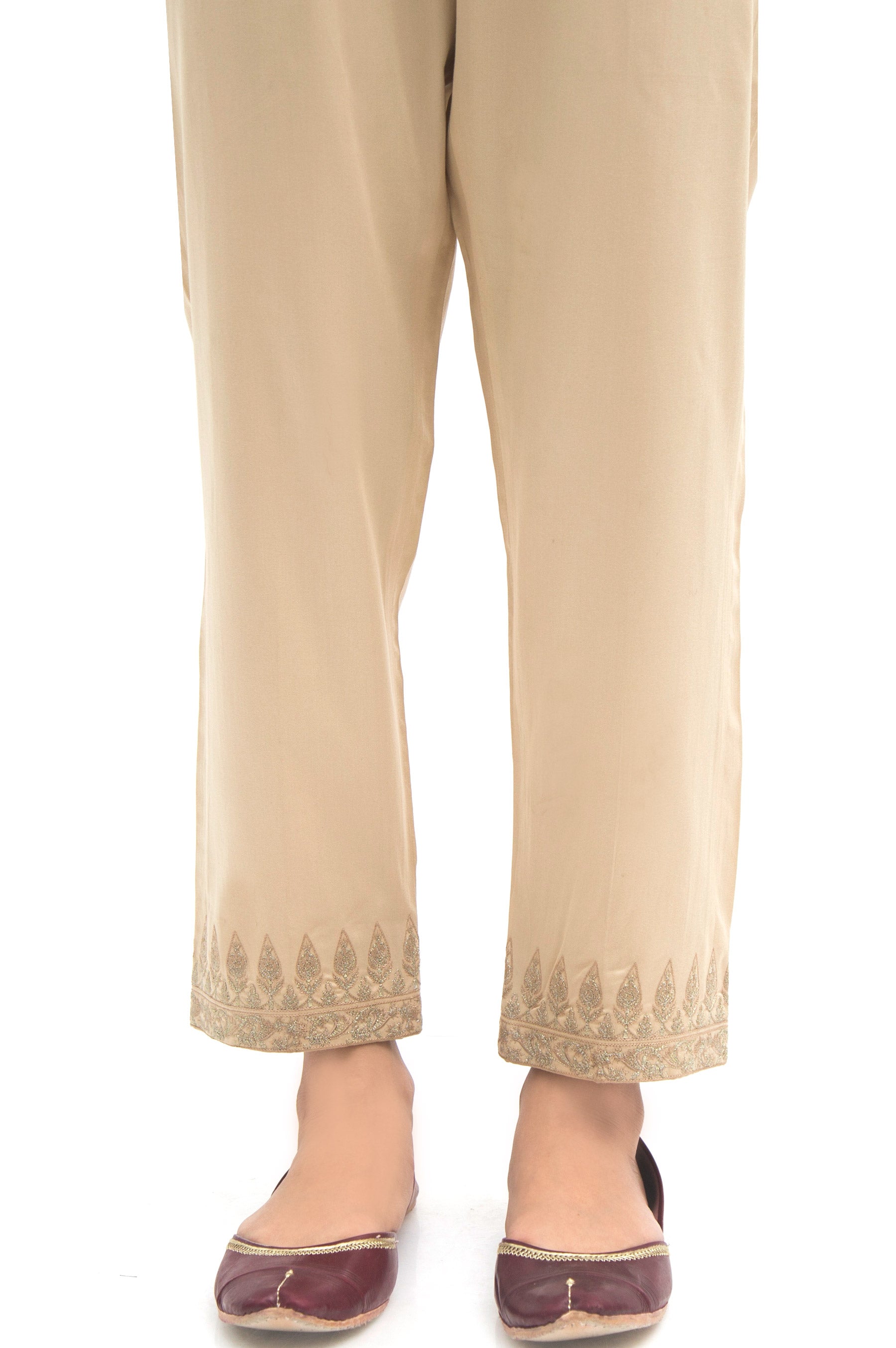 Embroidered cotton satin cigarette pant embroidery on hem line.