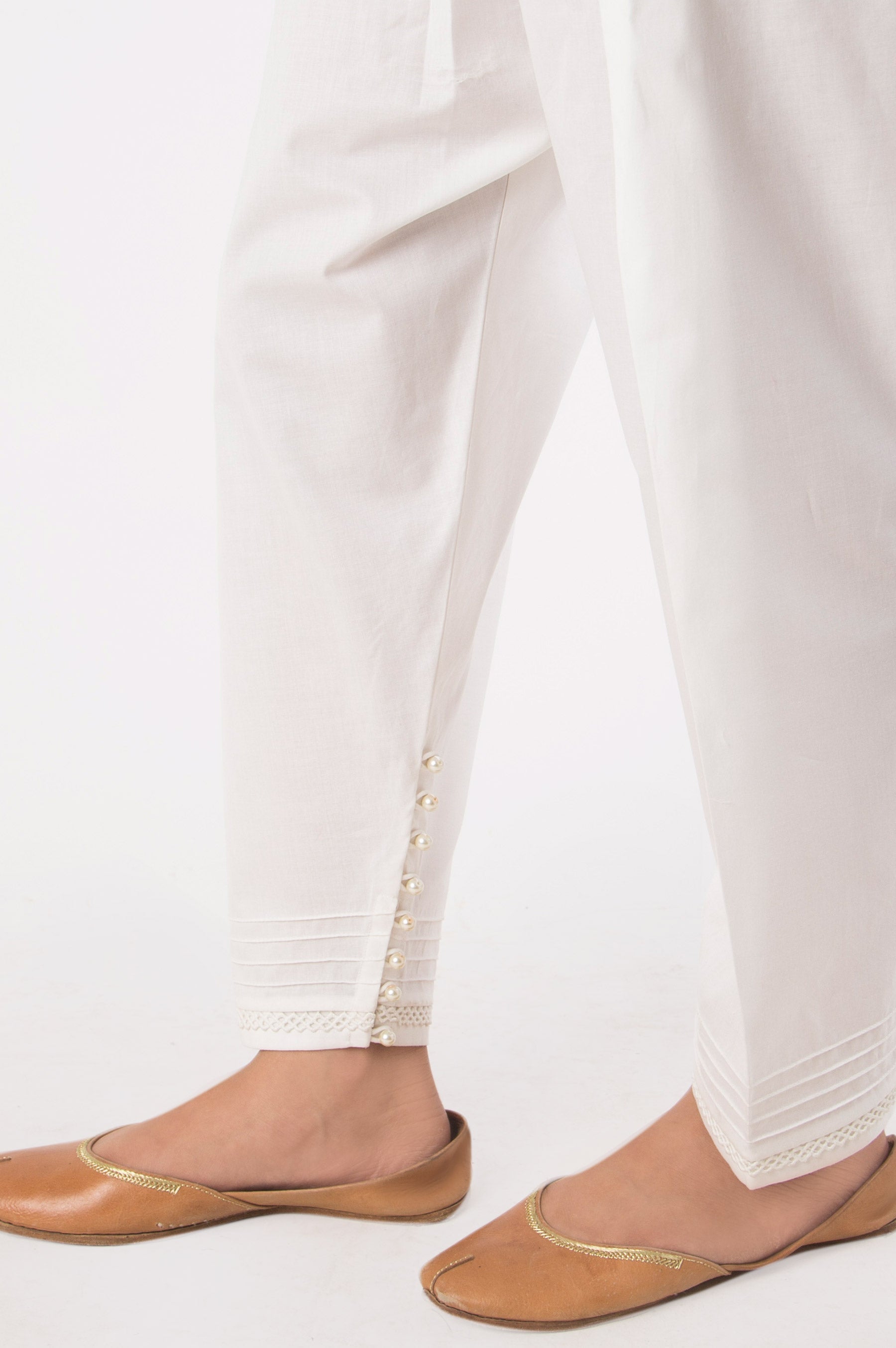 Trendy shalwar with pintucks, lace and pearl detailing for an everyday outfit.