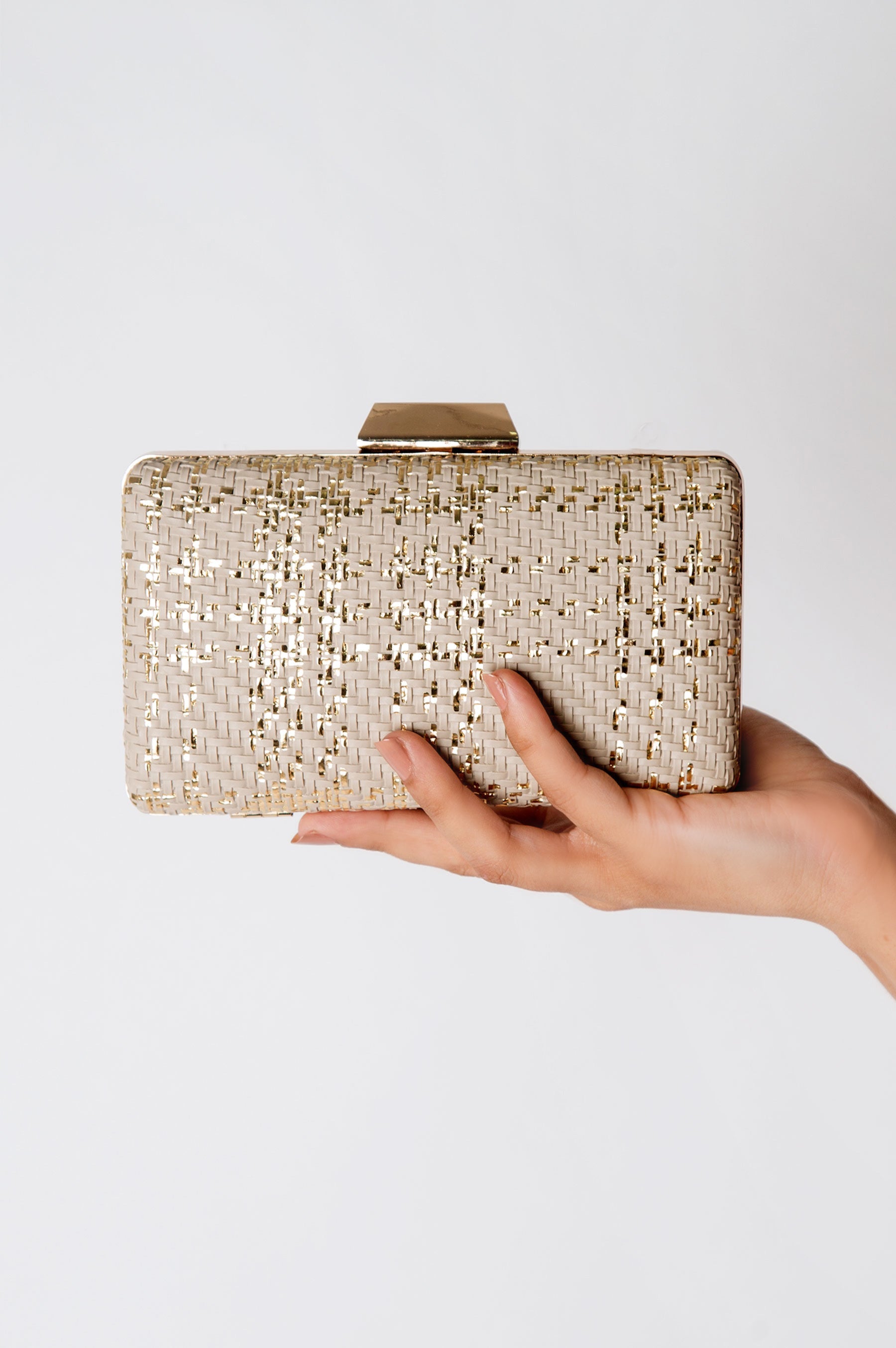 Put up a modern spin on classic style with this two tone free-stitched clutch in Gold Accent. This accessory spells out a suave and cosmopolitan feel.