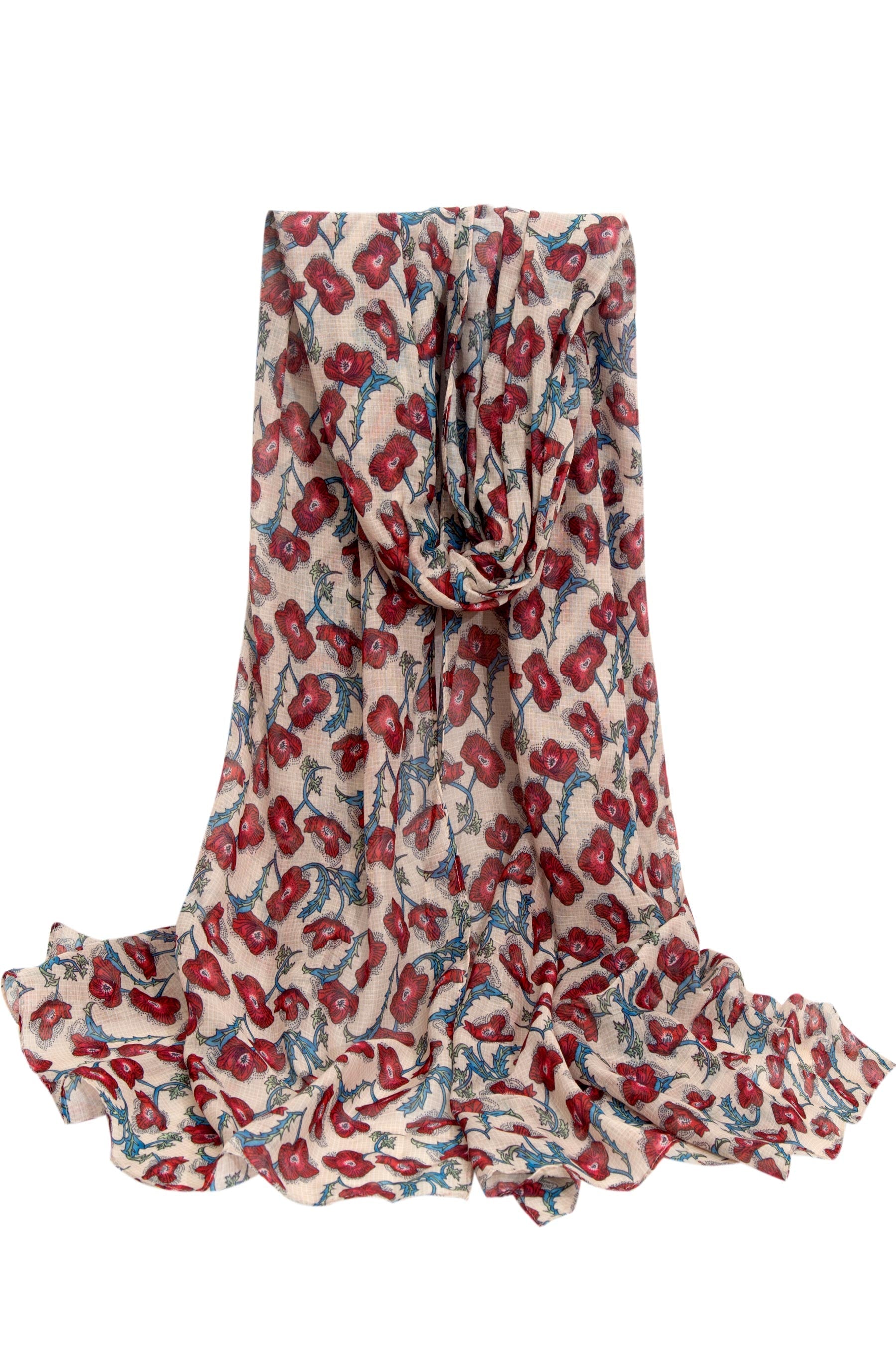 Deep colored floral patterns on a light base. The vibrancy of this scarf adds a pop of color to your outfit.