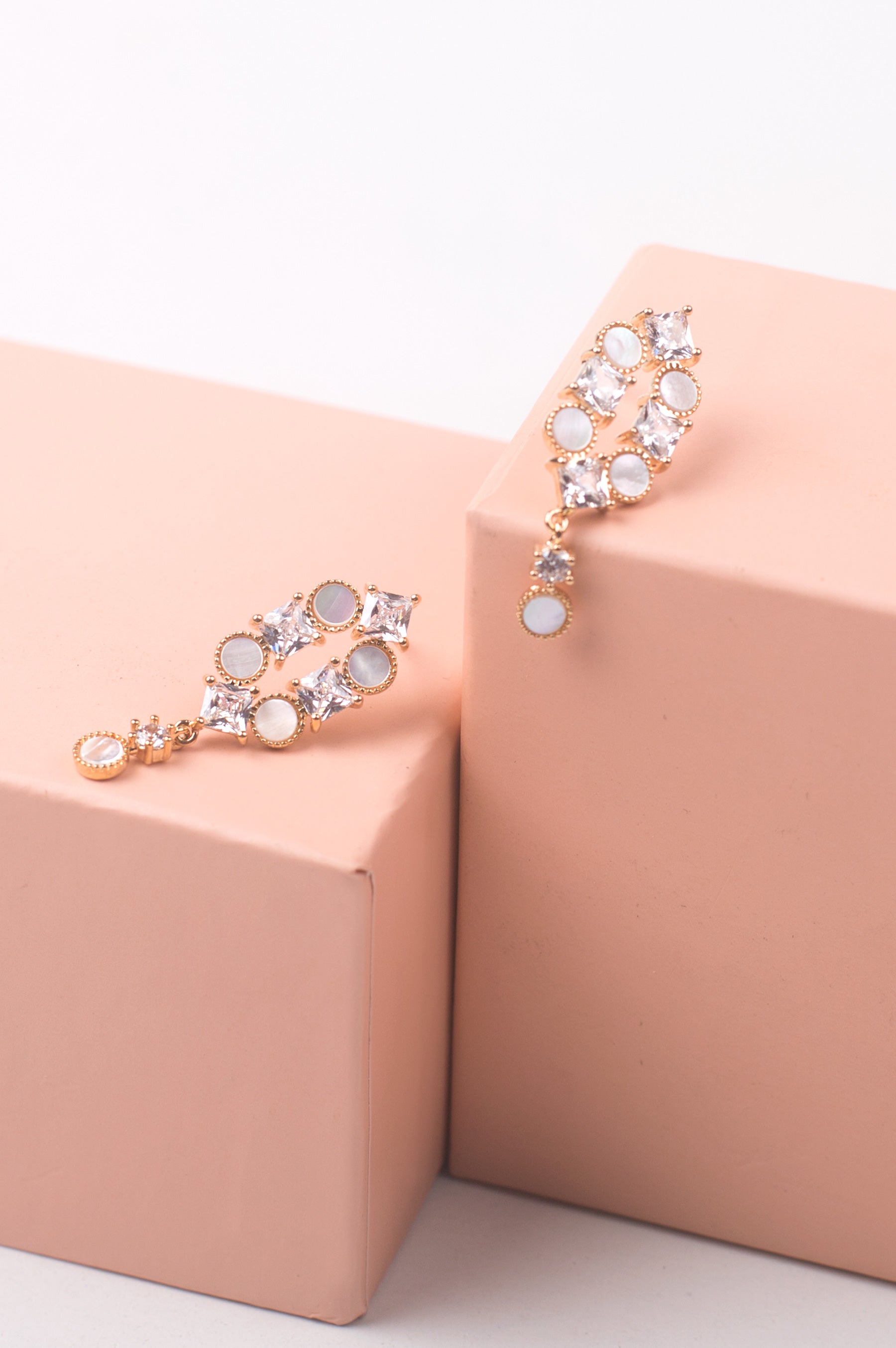 An arrangement of mother of pearl and glistening zirconia stones in the classic teardrop kundan inspired setting. In cased in dull gold these will become an eternal favorite in anyone’s jewelry collection.