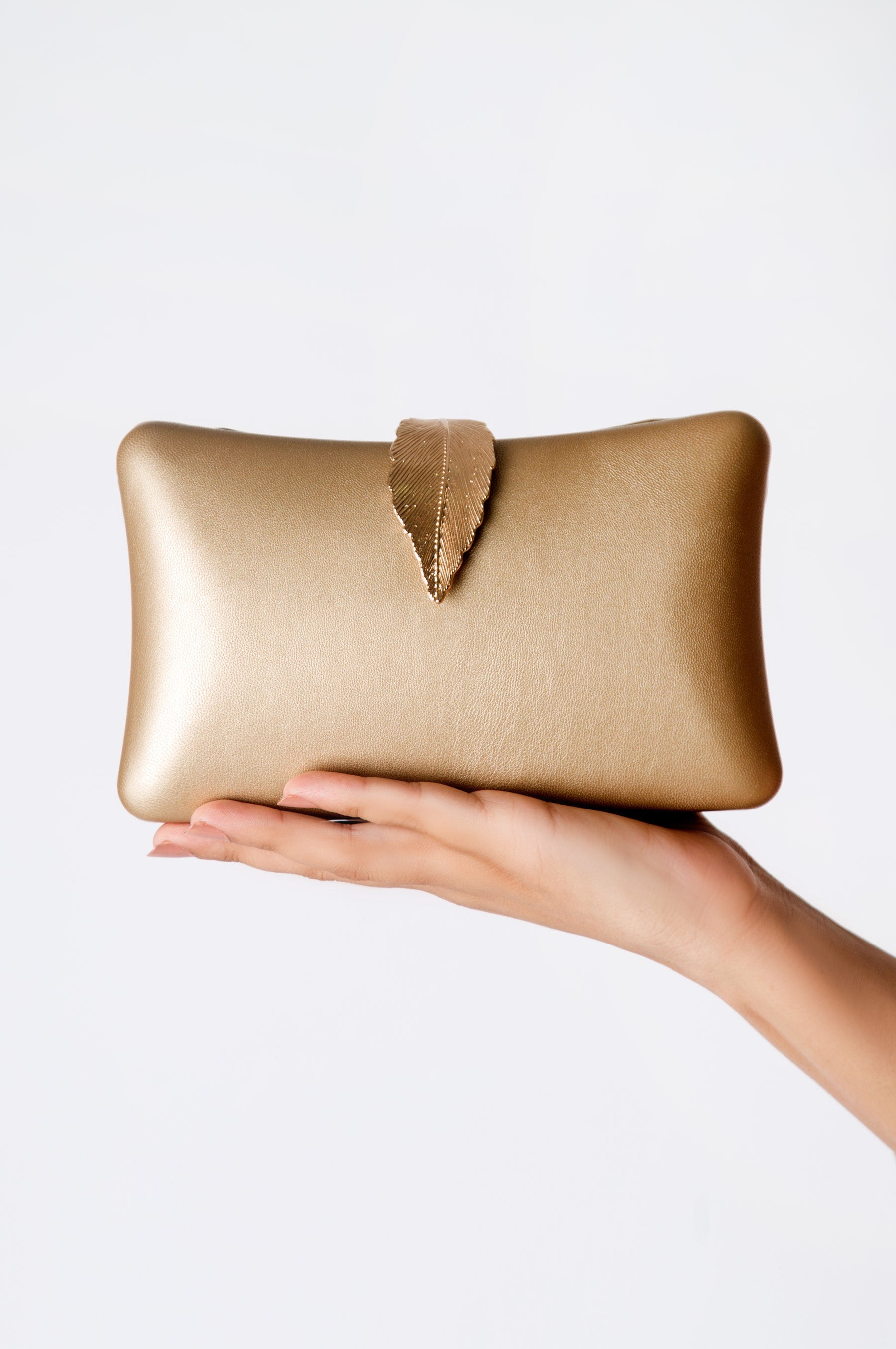 Make a dazzling fashion statement with this eye-catching clutch enhanced with a carved metallic leaf lock detailing,