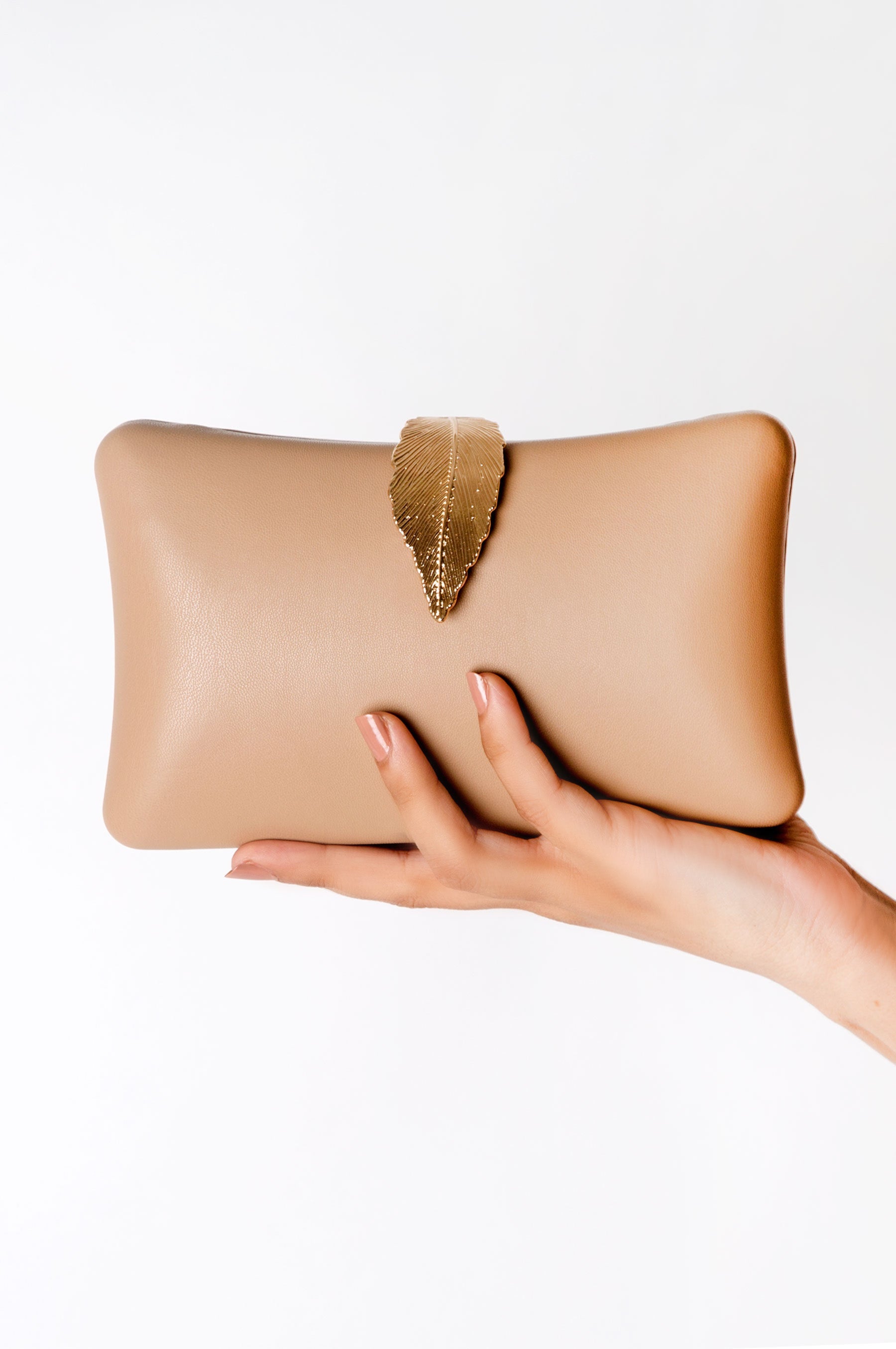 Make a dazzling fashion statement with this eye-catching clutch enhanced with a carved metallic leaf lock detailing,
