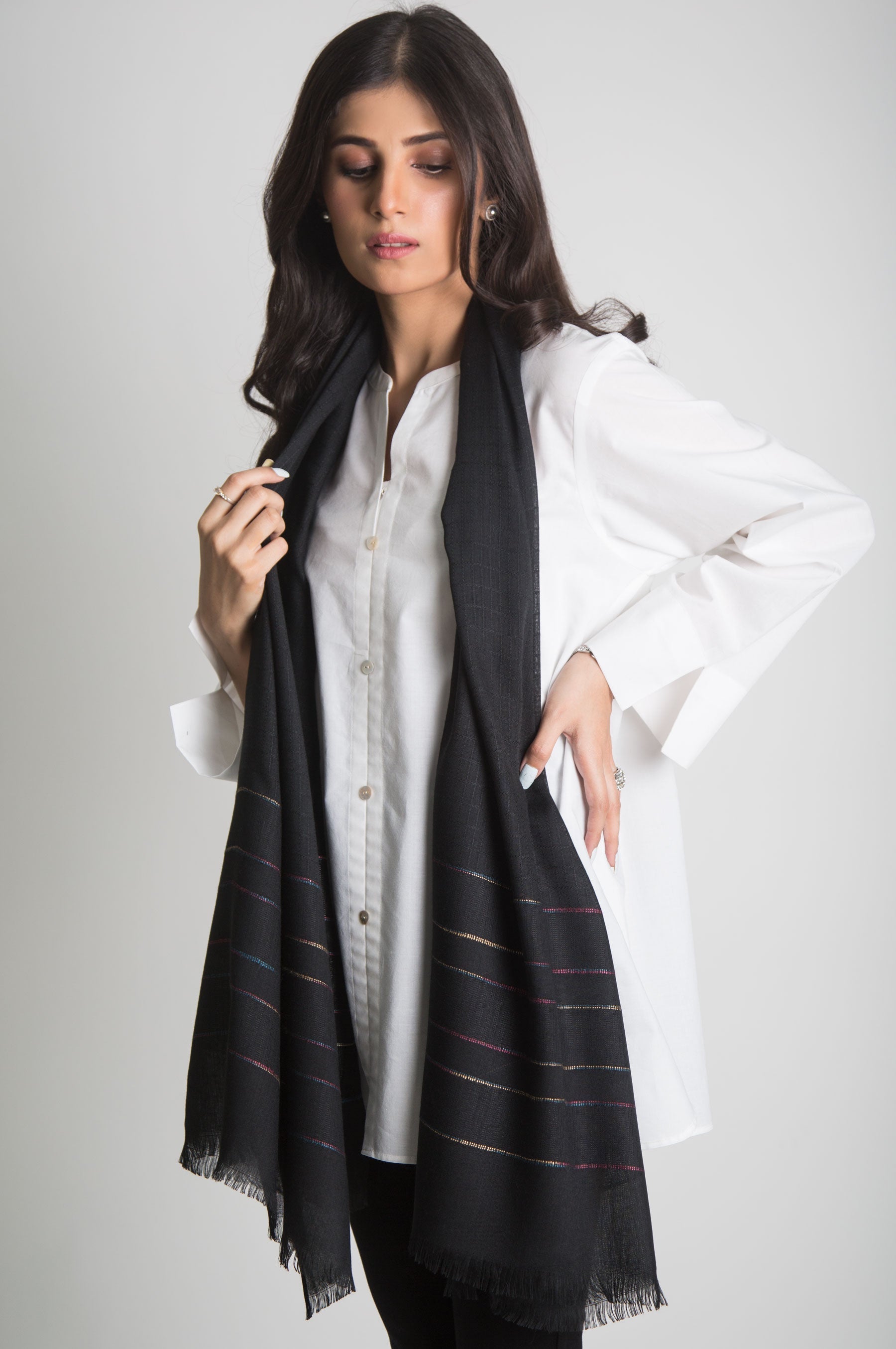 A cozy scarf with colorful stripes is ready to give you chic summer style.