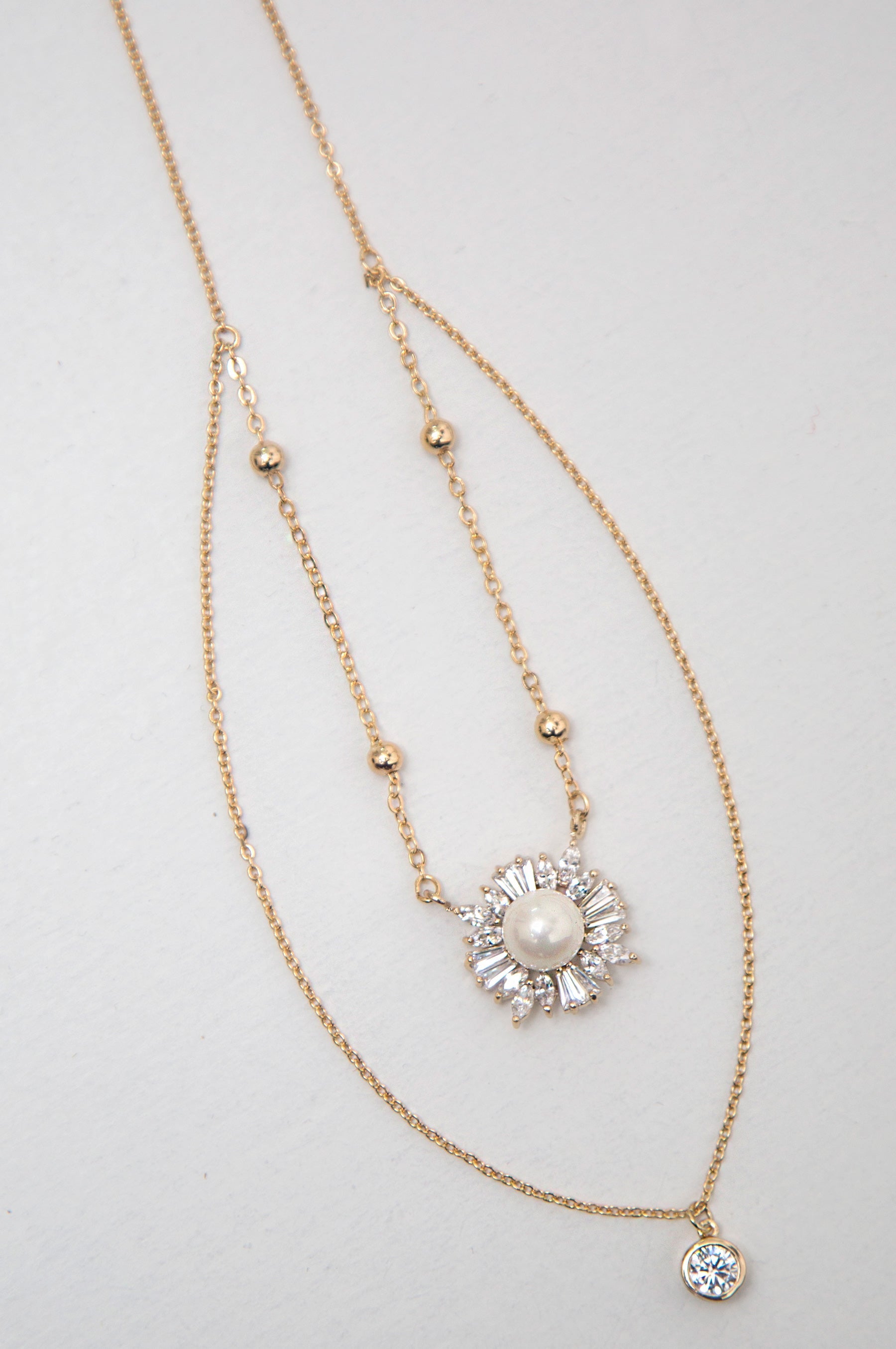 Get an easy & stylish layered look through this gold plated necklace featuring pearl halo pendant with stone drop.