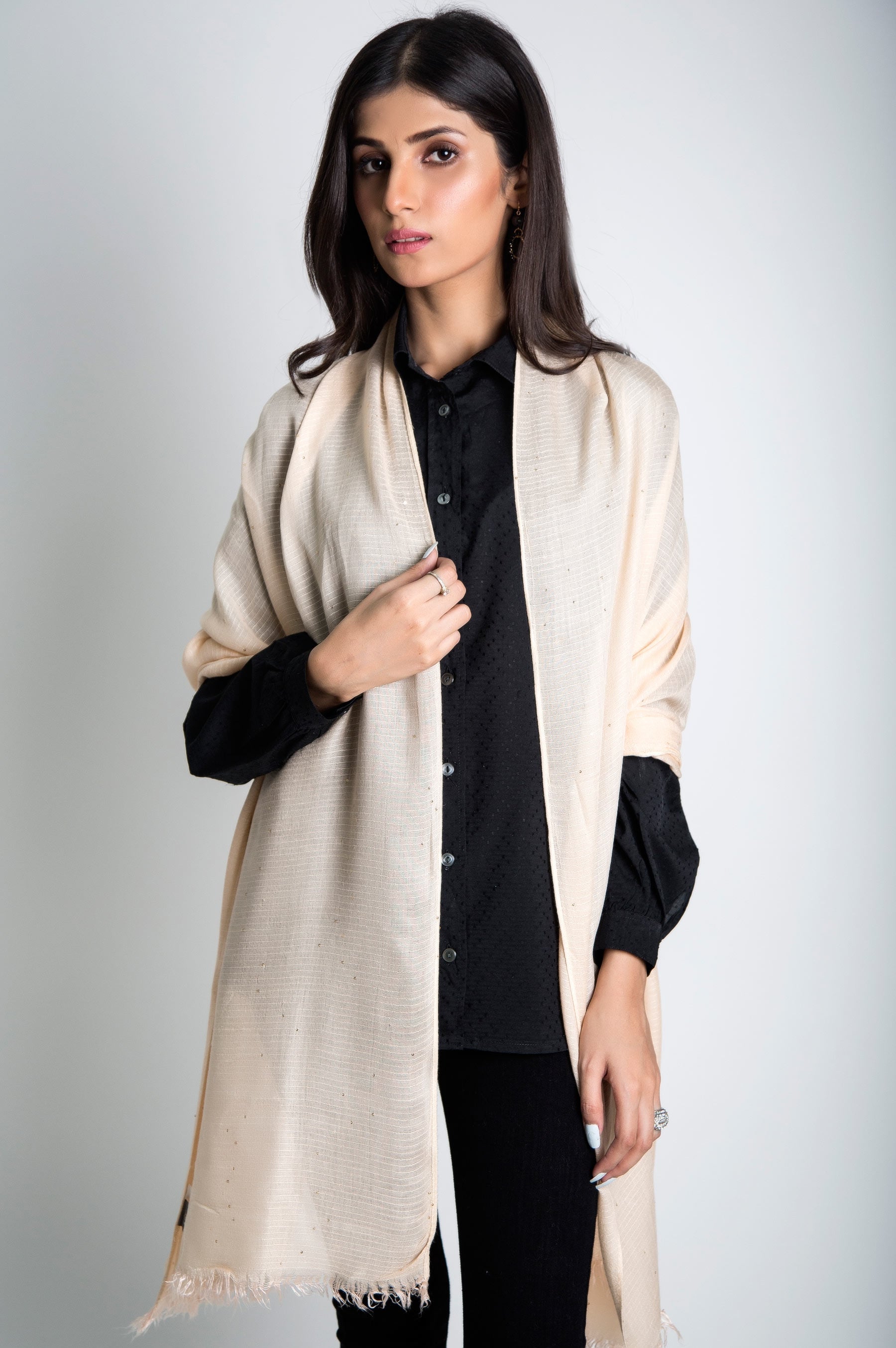 A soft and airy visoce scarf with sequince and fringes is ready to give you a chic summer style.