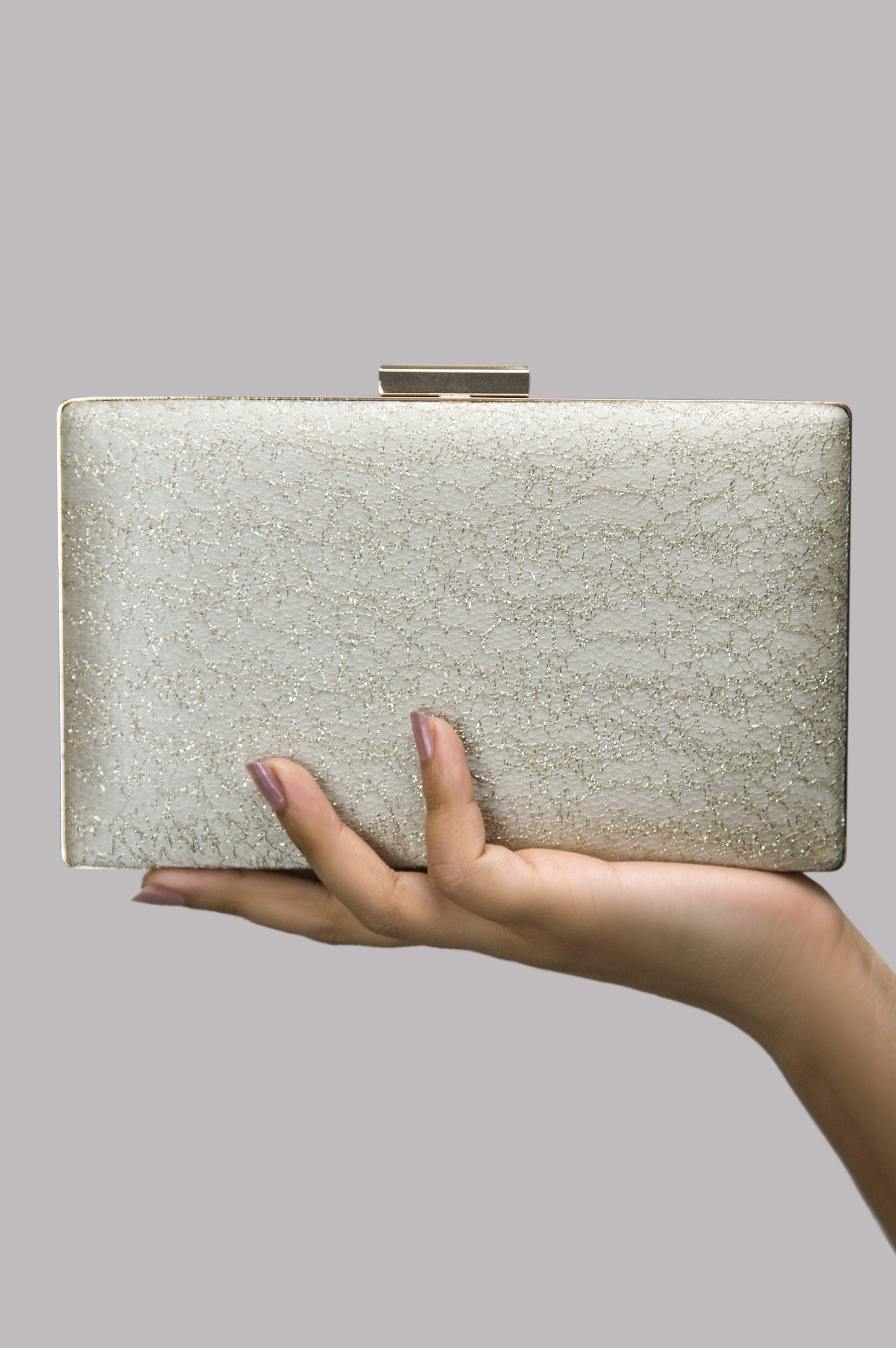 Textured box clutch with glimmering fabric in compact frame is a glamorous evening accessory.