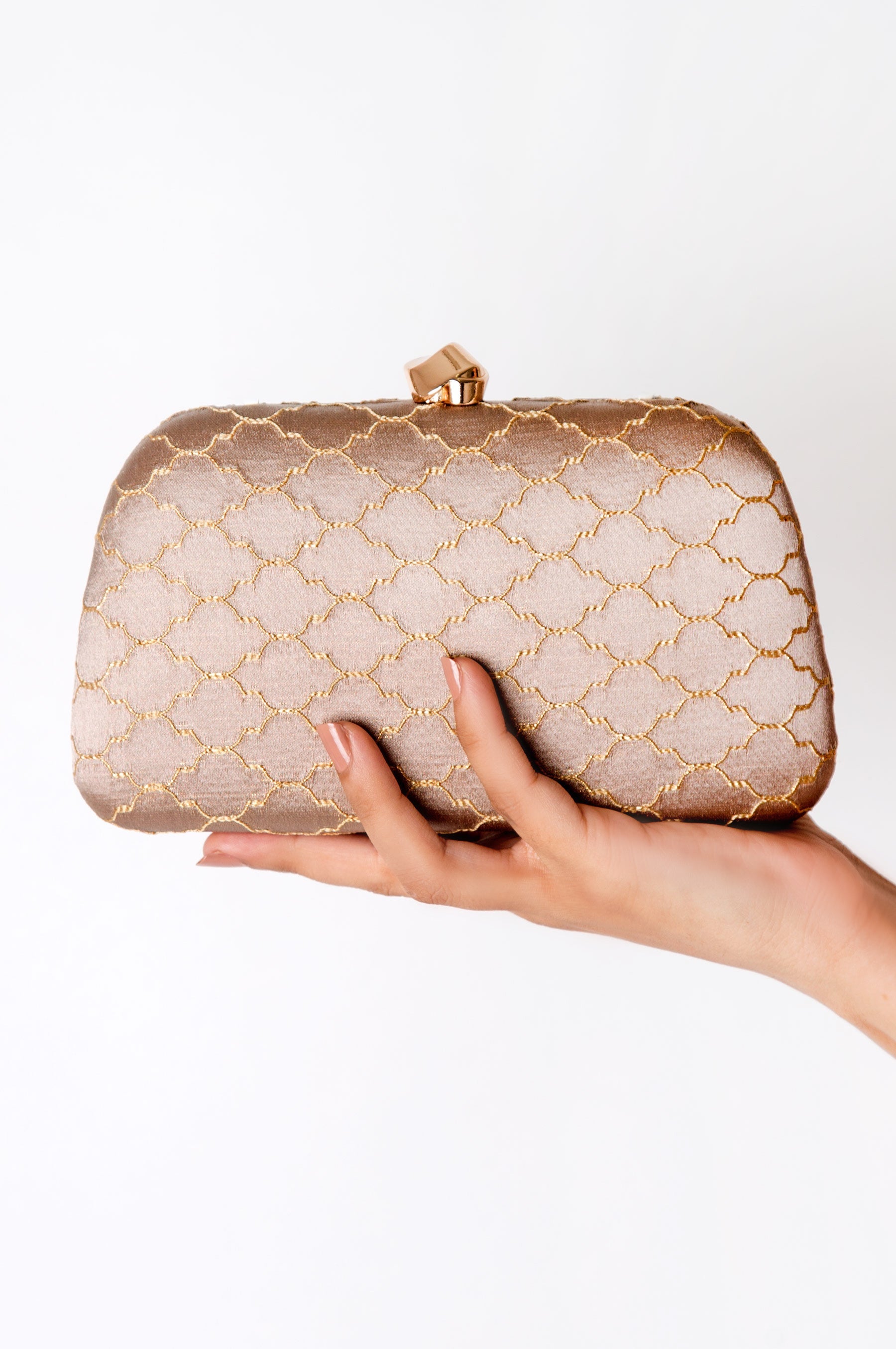 Modern yet timeless - this chic clutch with a weaved pattern detailing in gold threads is a perfect day-to-night clutch.