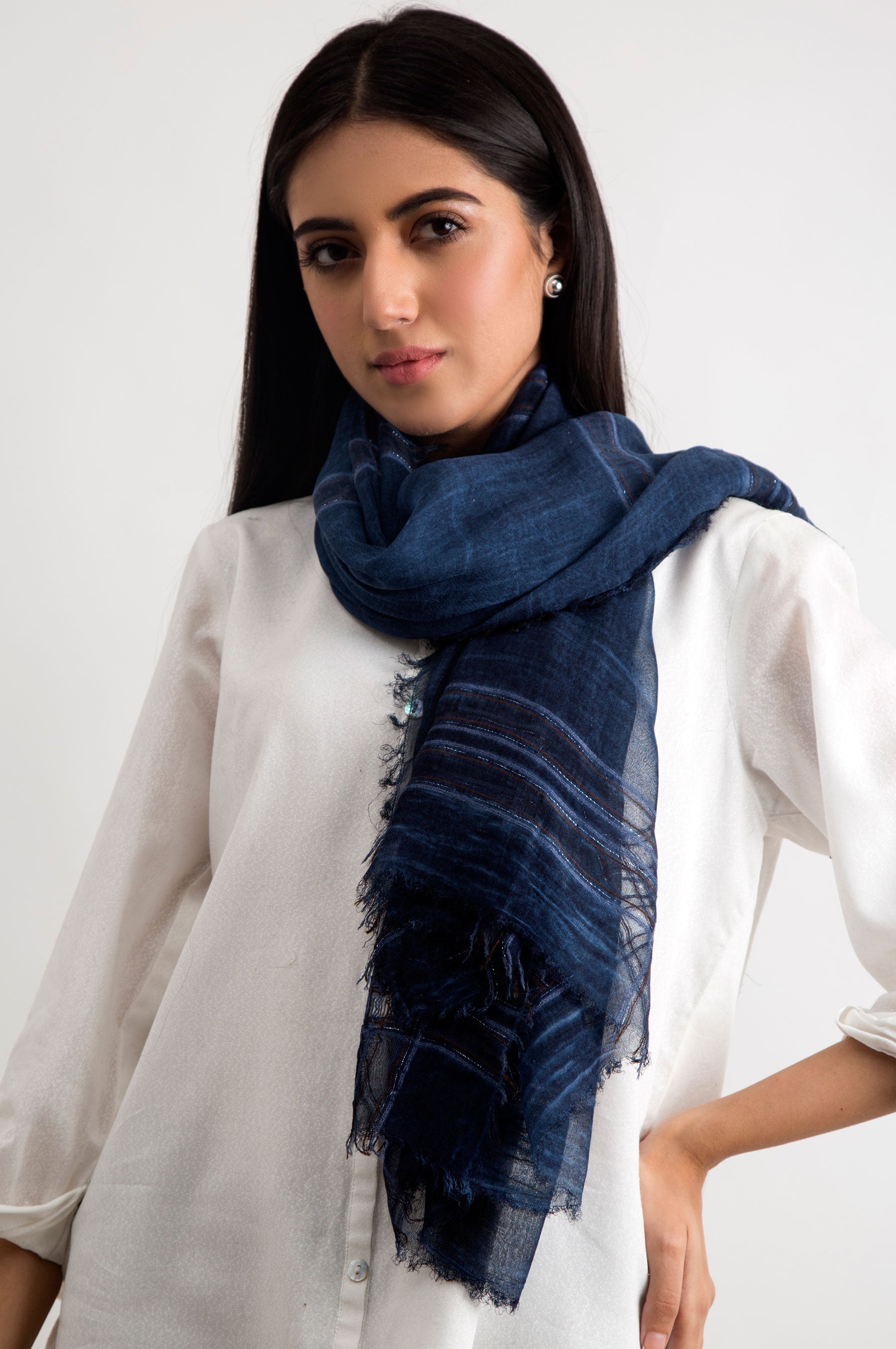 Extremely lightweight, the airy weave with woven plaids makes this soft scarf with raw edges a perfect summer accessory.
