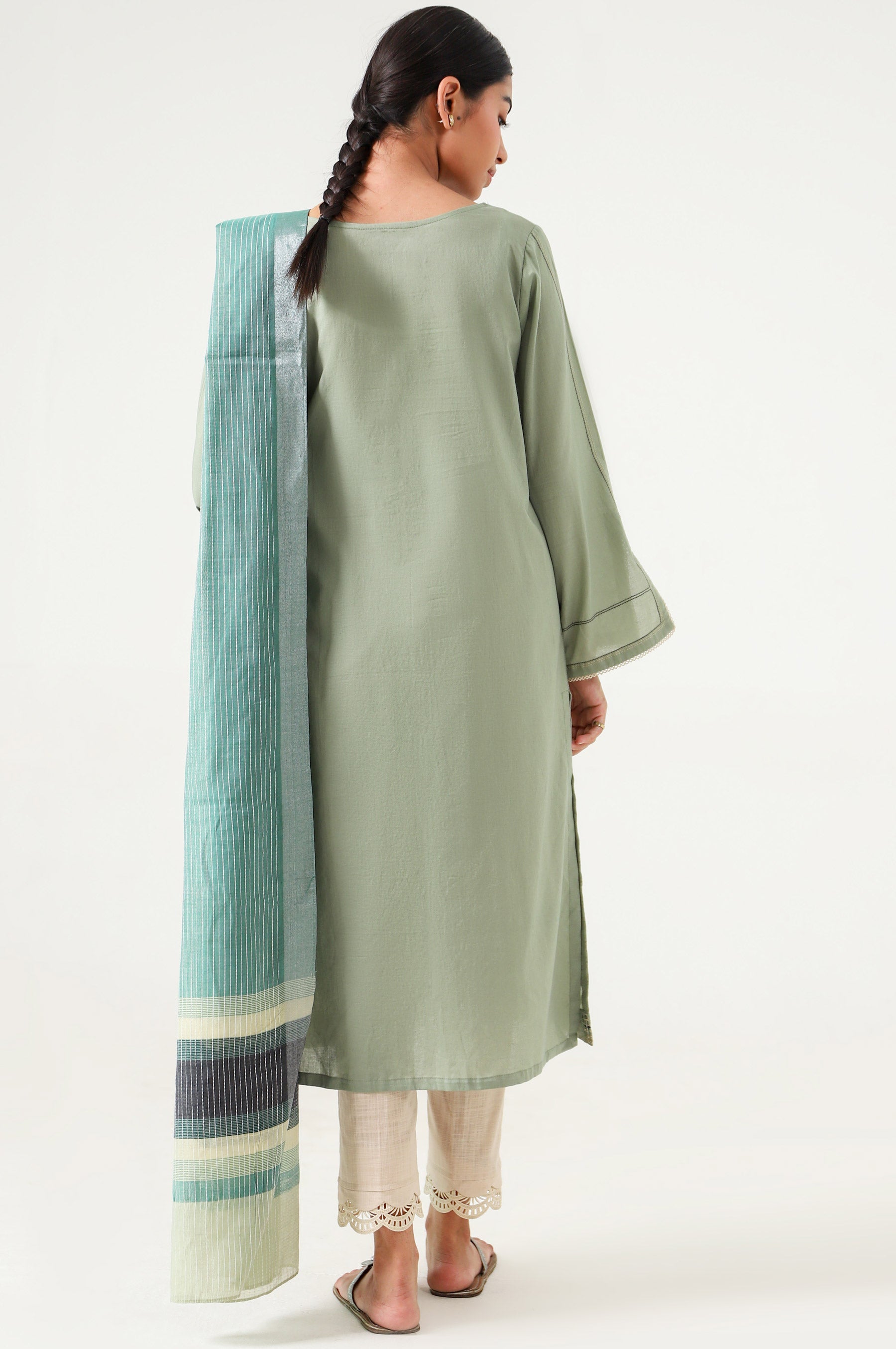 Zeen's signature aesthetic comes into play in our Cambric sage green kurta rendered with off-white and a hint of blue and green embroidery.The slit on the sleeves with lace and running stitch detail add a statement to your look.This enchanting outfit comes with a stripe dupatta that can be worn season after season.