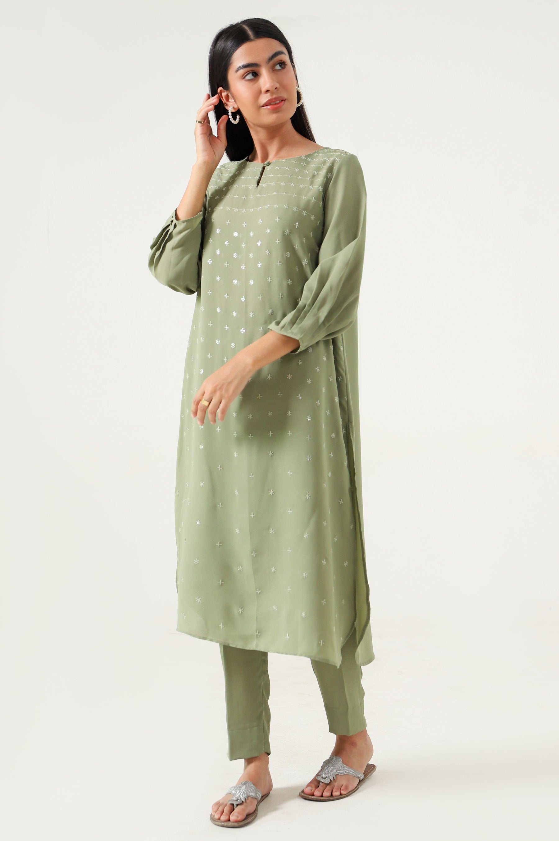 One color tone are the new new trend. Be sure to be on trend at any event with this sage green co-ords composed with stunning gradient floral embroidery highlighted with sequins. This sure to be season favorite.