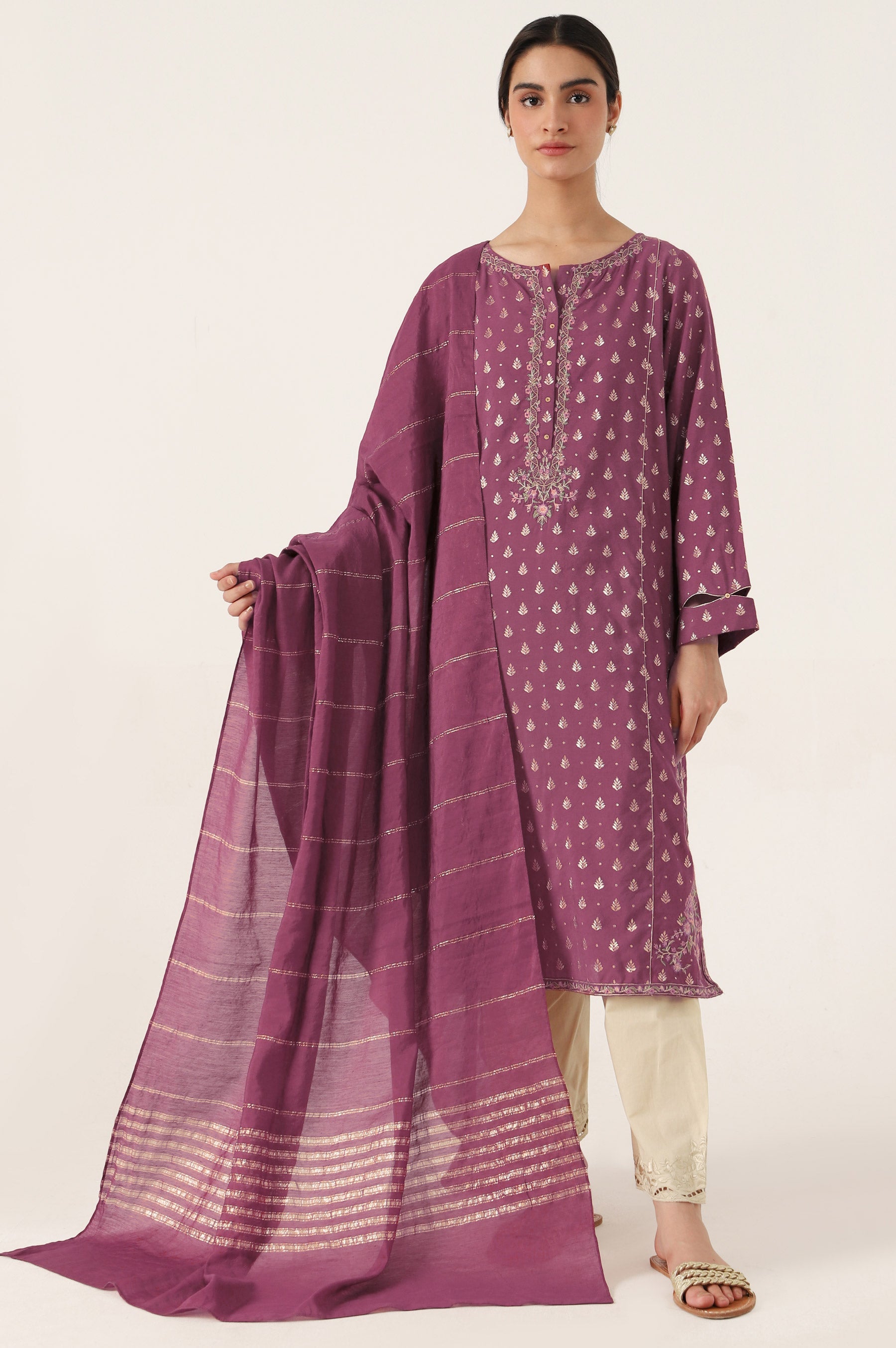 Opt for this luxurious outfit with muted embroidery on the neckline and daman making it a perfect fit for any festive season.Pair this stunning outfit with matching dupatta.This look will set you apart from the crowd.