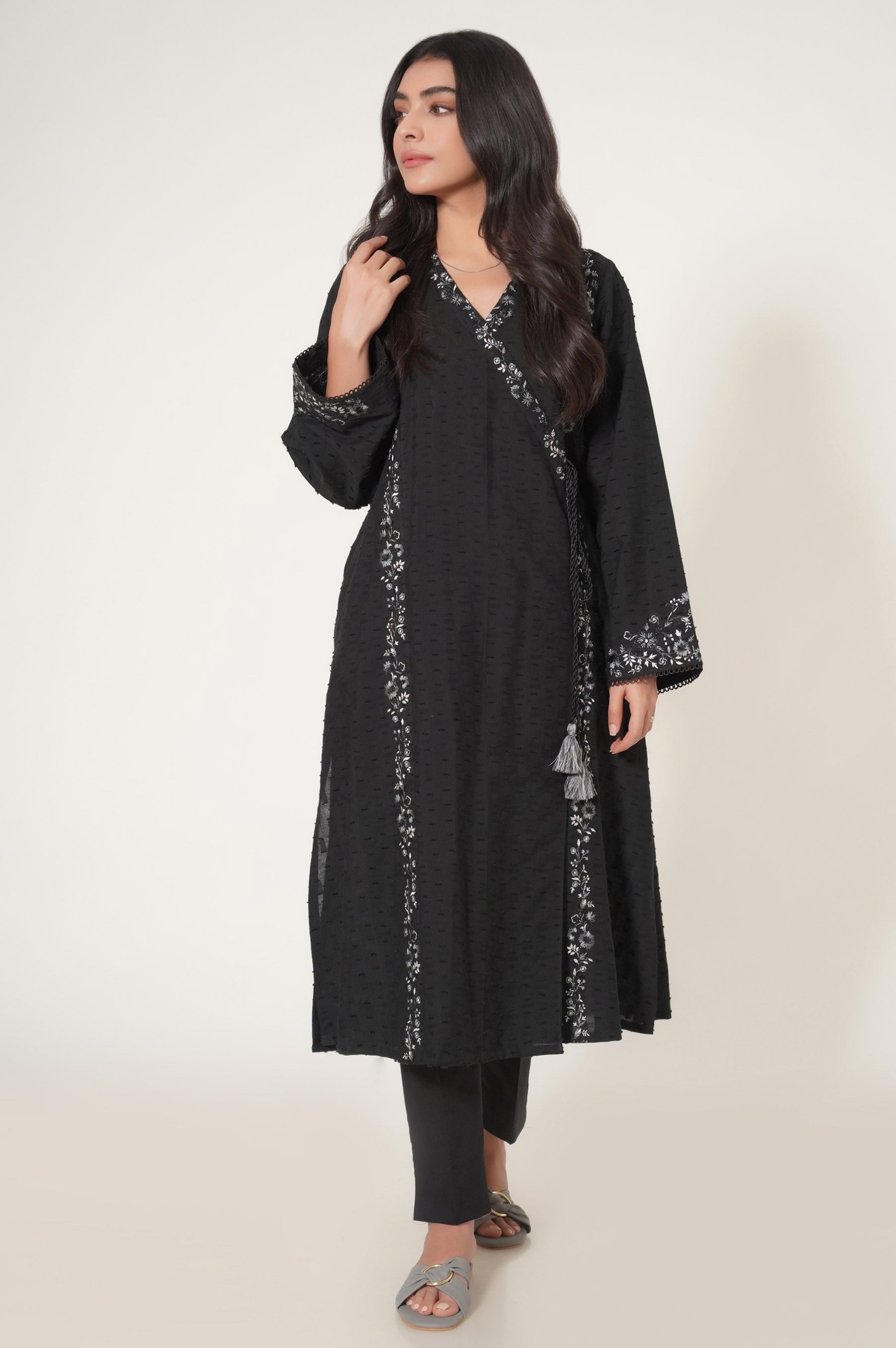 This beautiful angrakha style shirt with open side slit consists of monotone chintz embroidery on front along with floral bunches on sleeves. To add more details lace has been added to the sleeve hem and neckline followed by a tassel on front. Its a must have this summer for your casual hangouts.