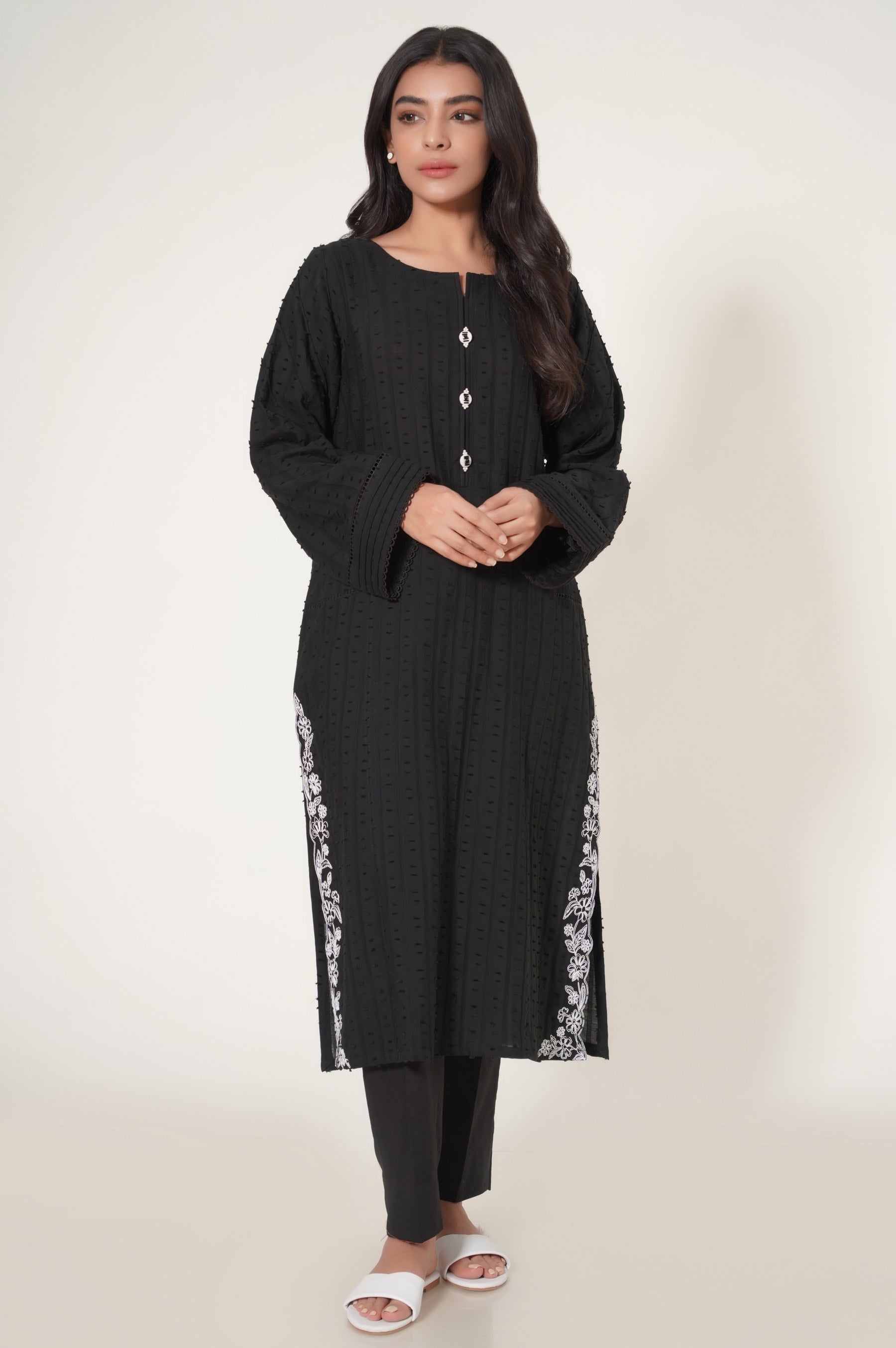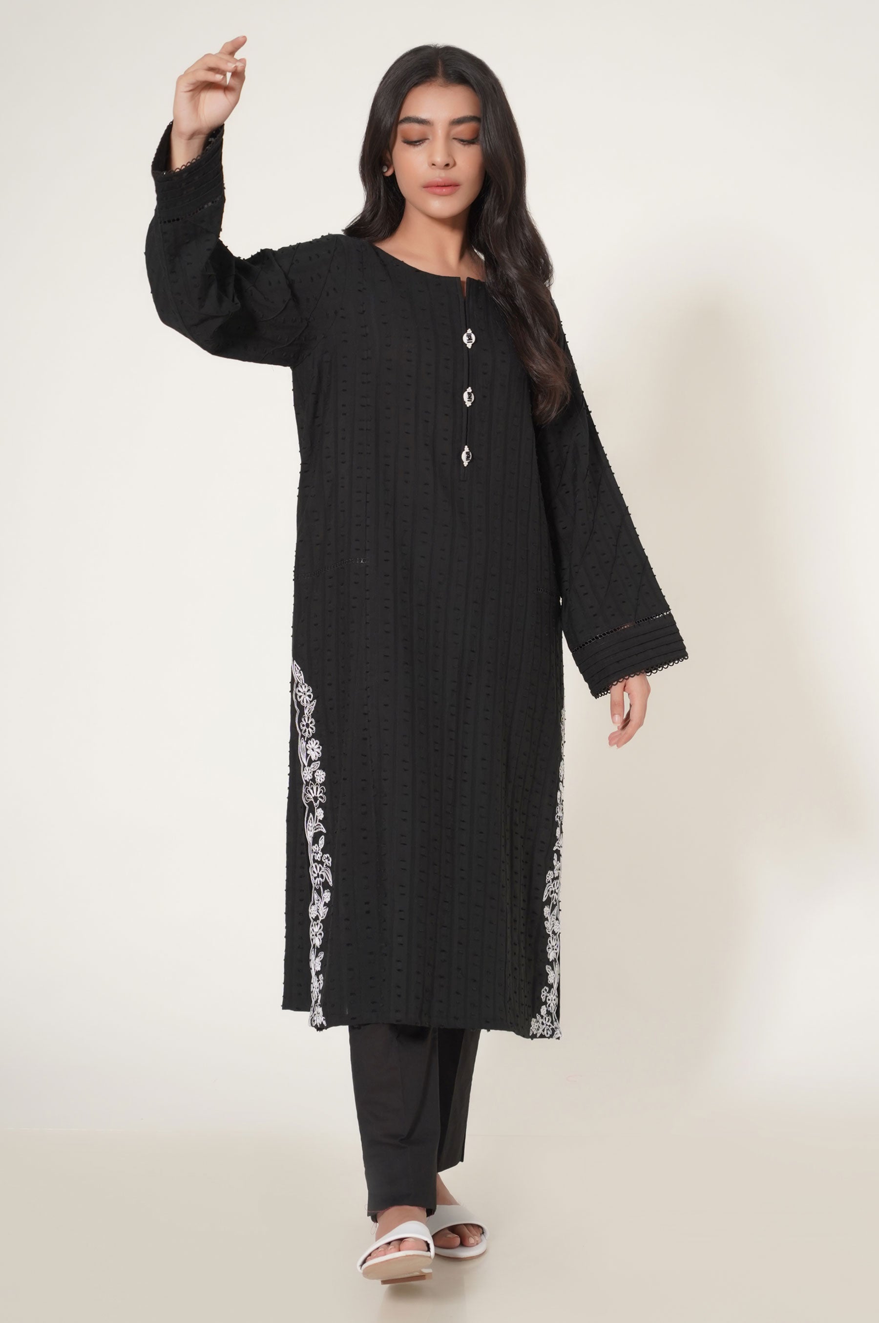 Style gracefully in this brochia outfit composed with contemporary floral embroidery on side chak, explored in dori technique. Additional detail added on the placket to complete the look.