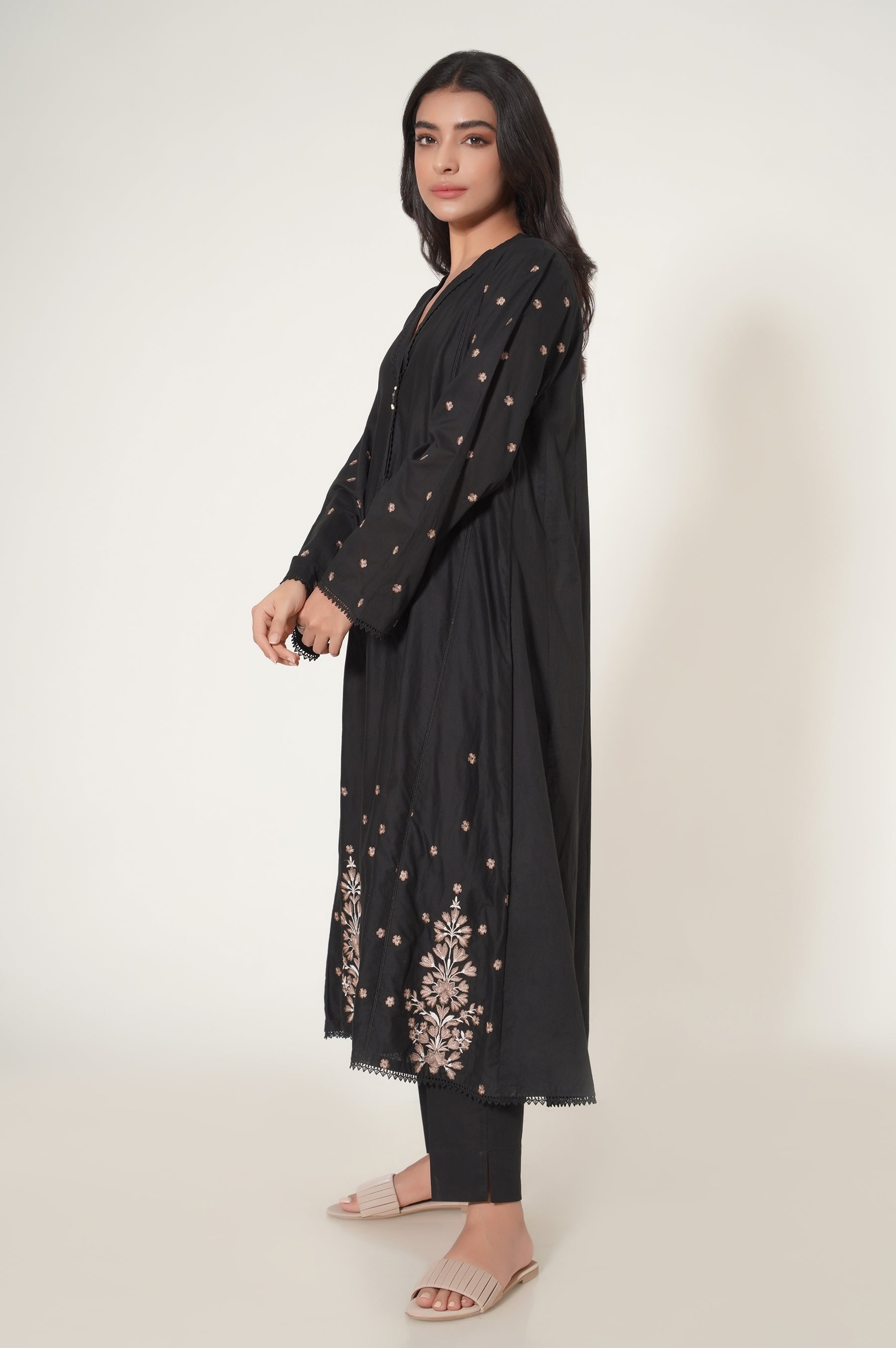 Black cambric kurta designed beautifully consisting of elaborate A-line silhouette. Floral embroidery bunches are placed on alternate panels along with cute floral motifs on sleeves. To enhance the neckline lace is added on the placket and sleeves hem followed by pearl and buttons embellishment. This gorgeous shirt can be paired with our stylized bottoms.