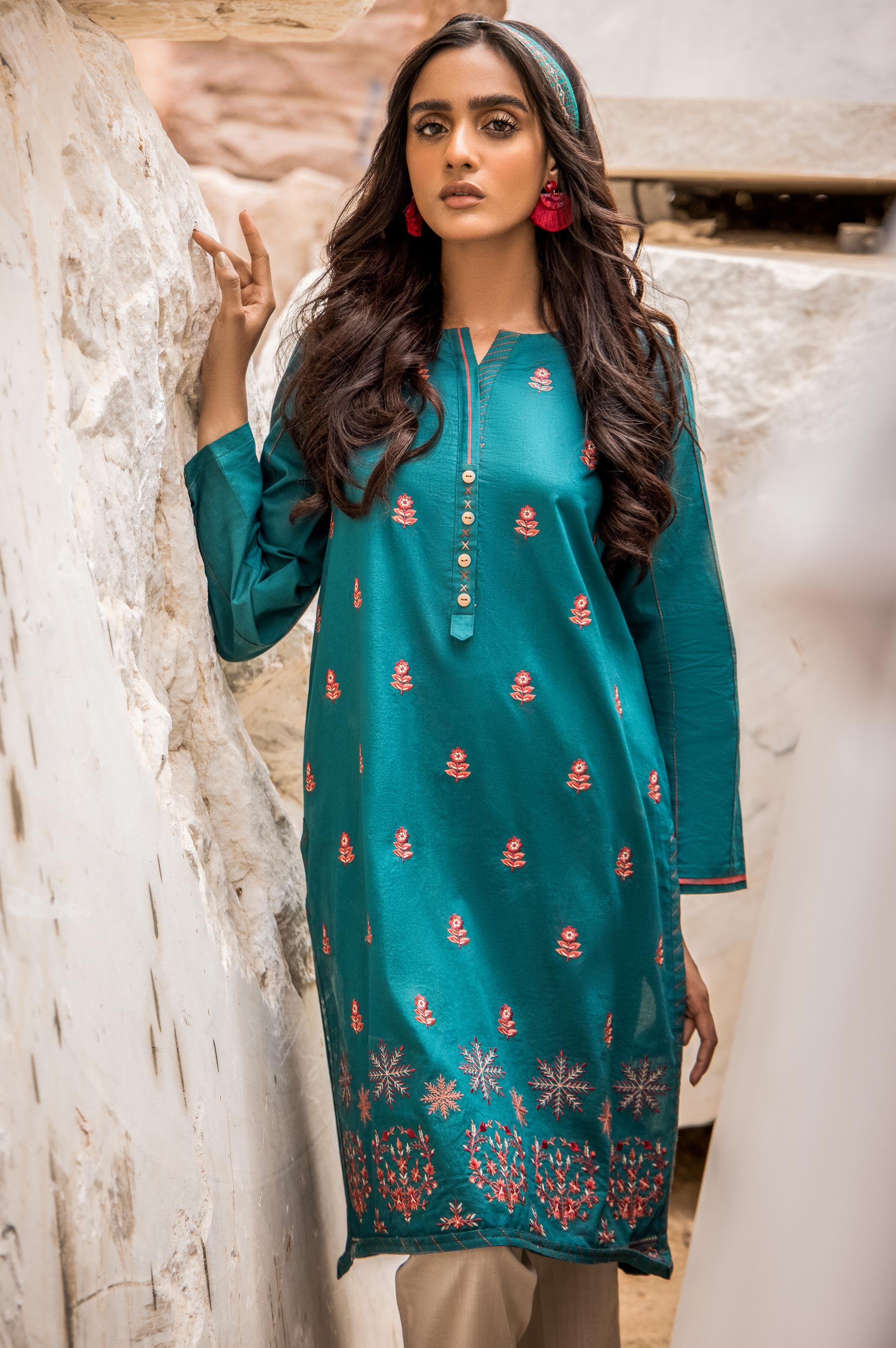In a world full of trends,express your versatile personality with this fashionable look.This Green kurta is imbued in bright contasting colored embroidery to bring the freshness to your wardrobe.