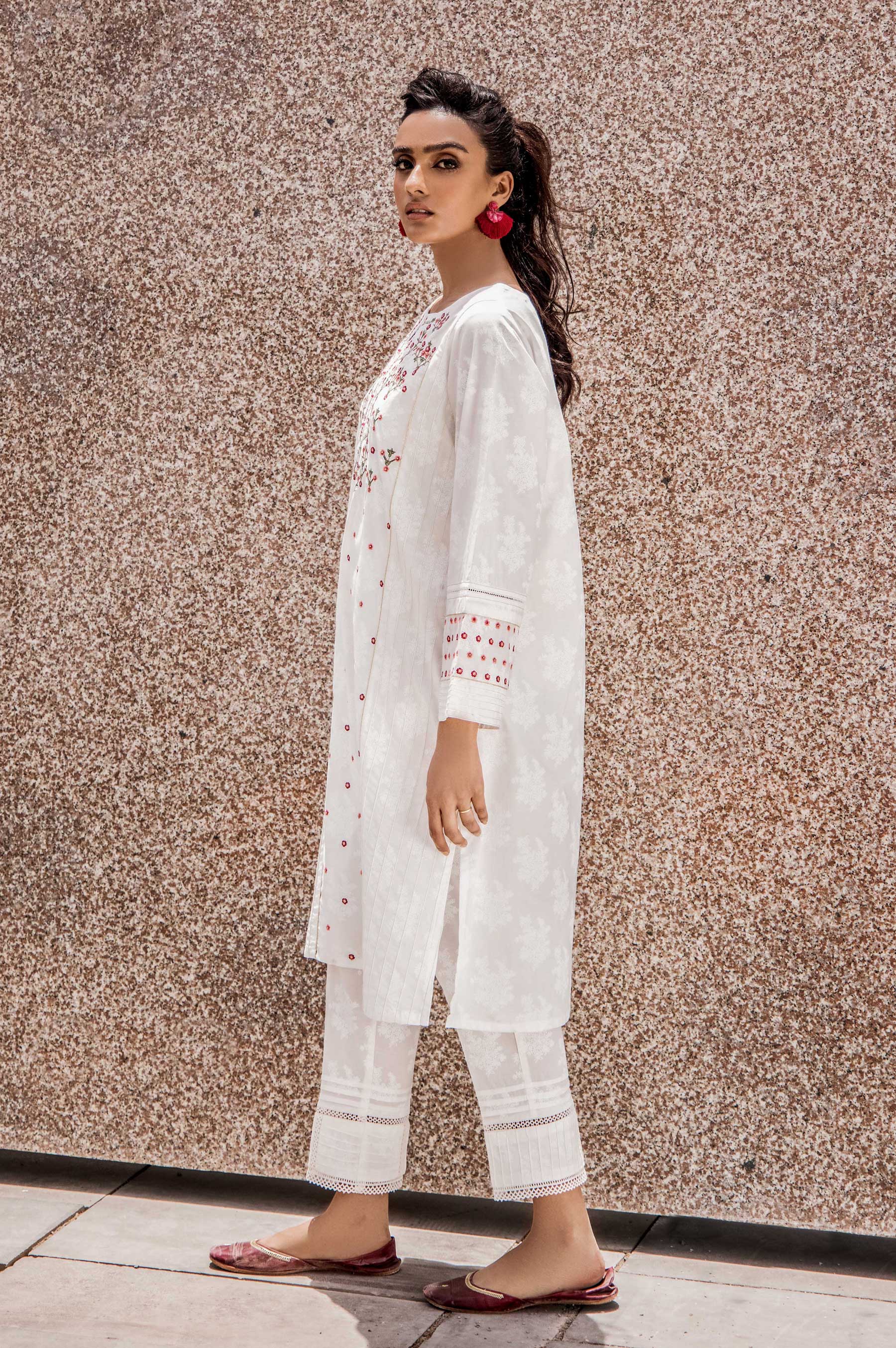 Start fresh with Zeen's white paste shirt that has embroidery in shades of cherry red and blush peach. It is stylized with pin tucks, gold stitches and lace which adds more to it's charm.Pair it with one of Zeen's cigarette pants for a crisp look.