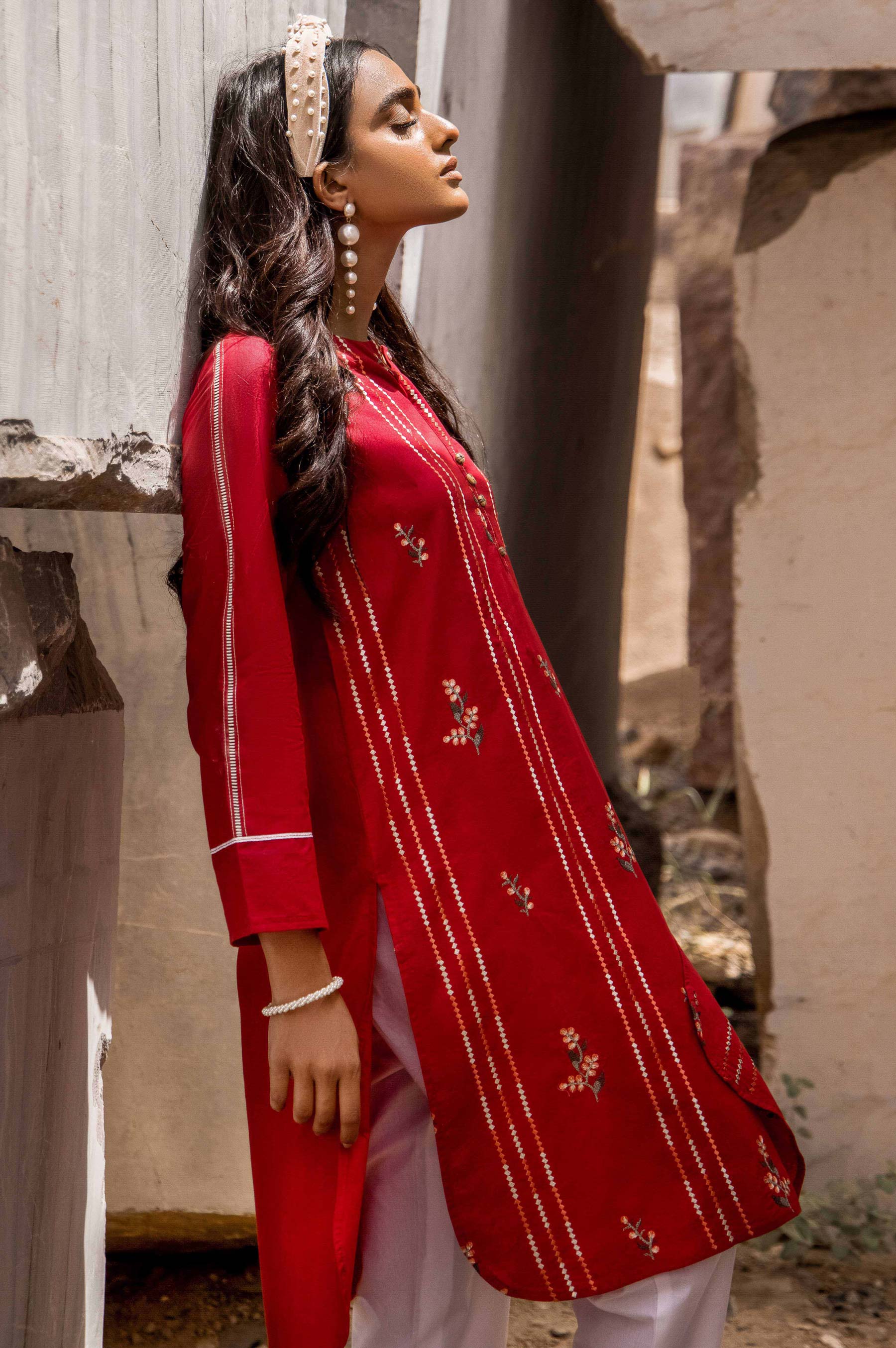Keep yourself looking Trendy and chic with this all over Emroidered crimson red shirt , stylized with laces and button on plackets.