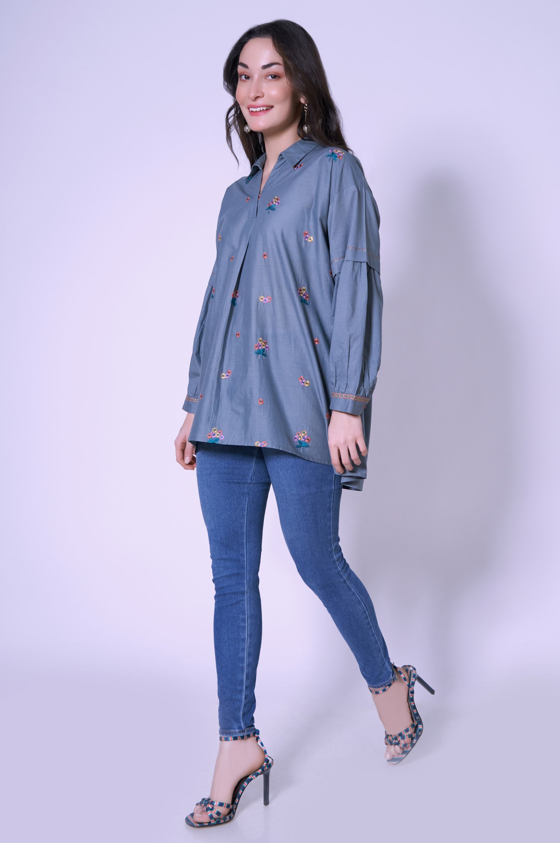 Style out in this blooming loose-fit top rendered in stone grey color. This fusion top is absolutely perfect to style at any fun occasion this season.