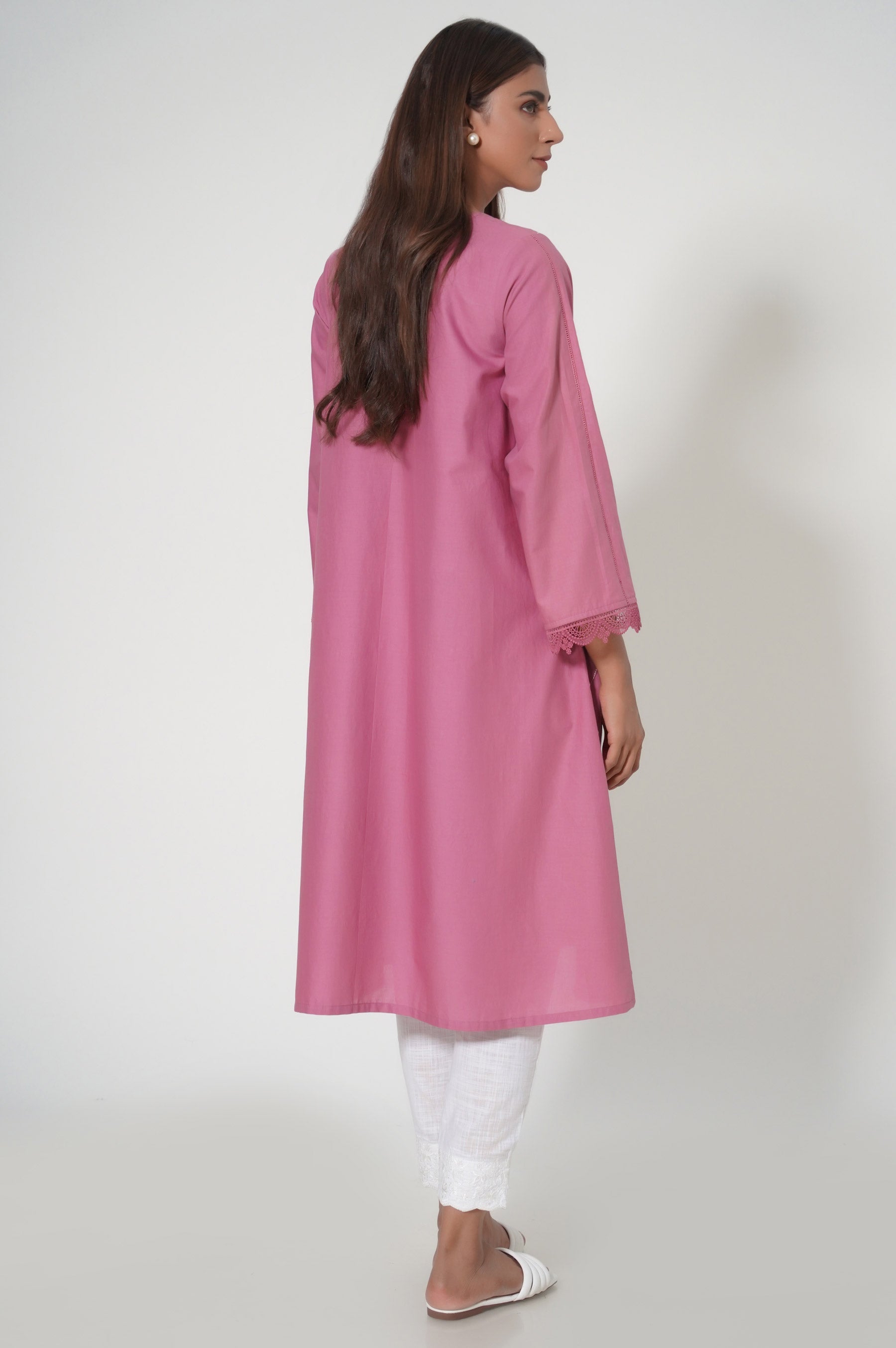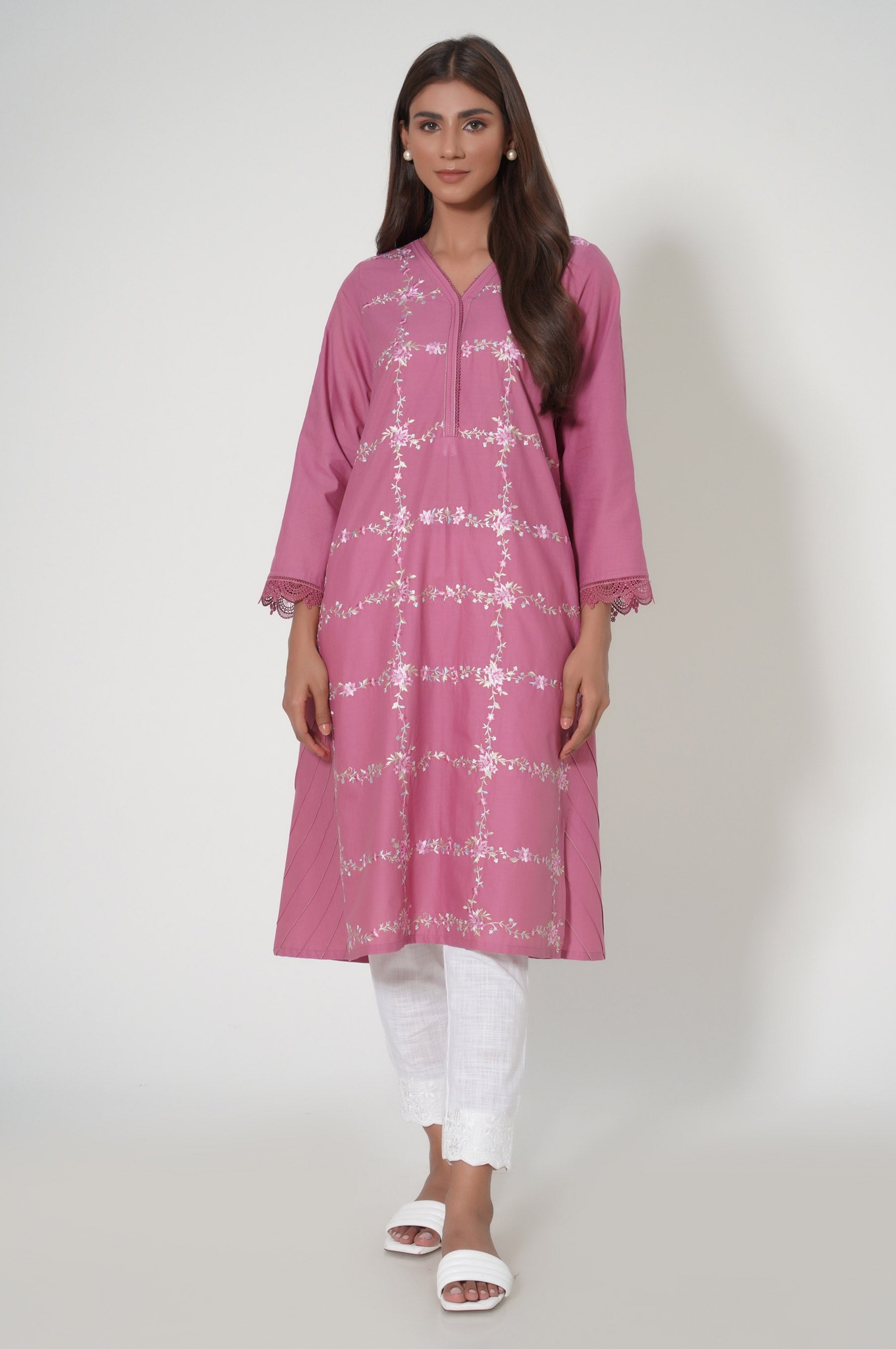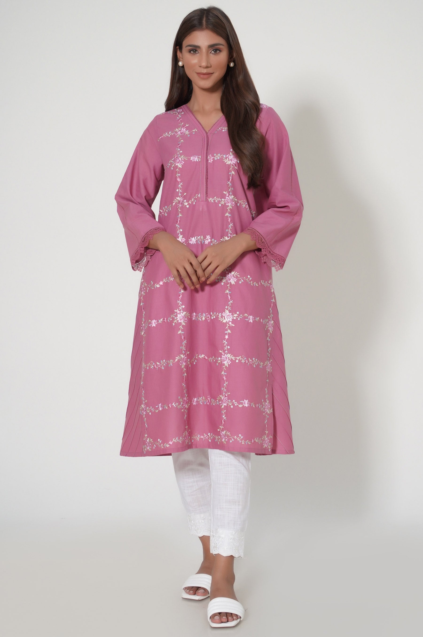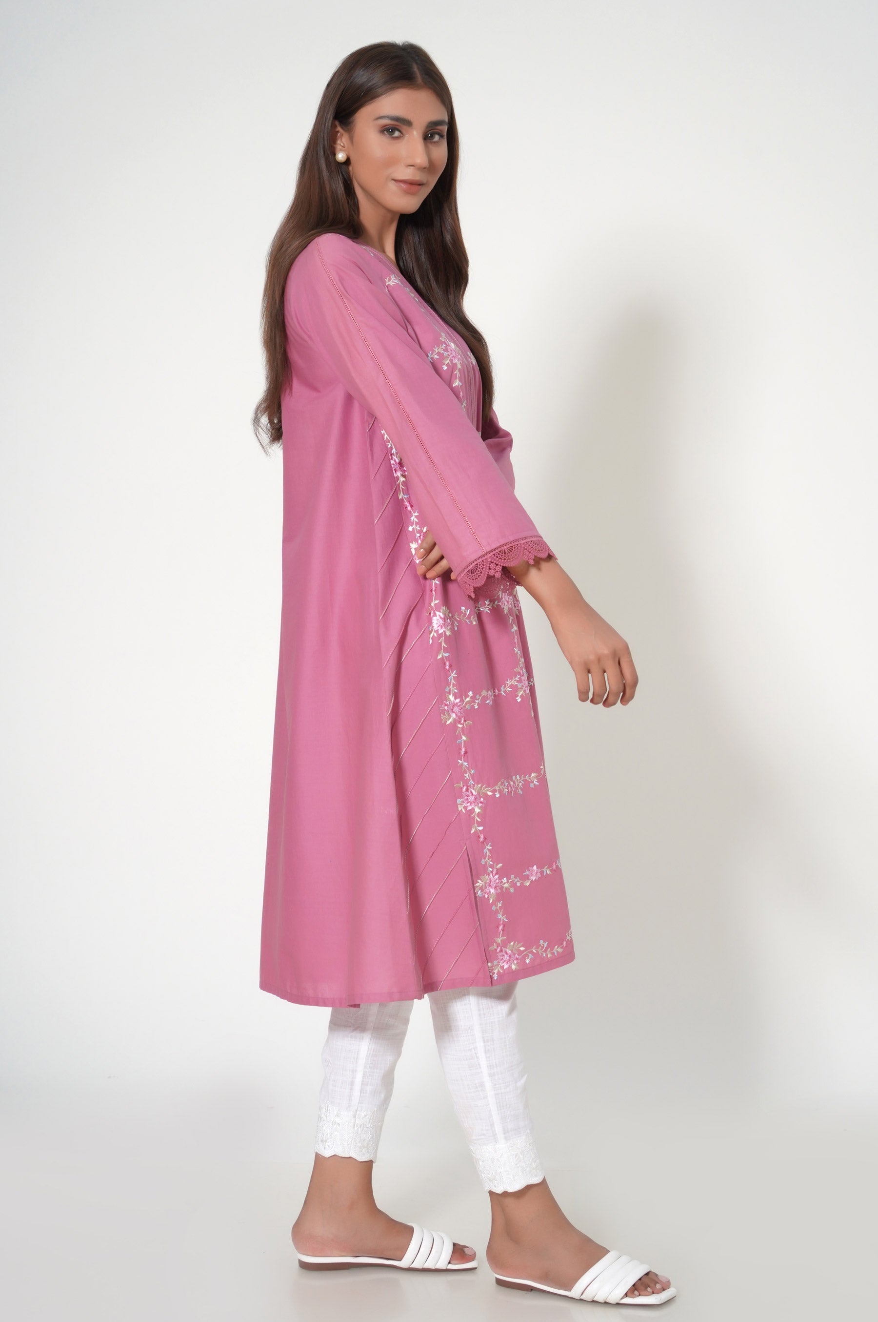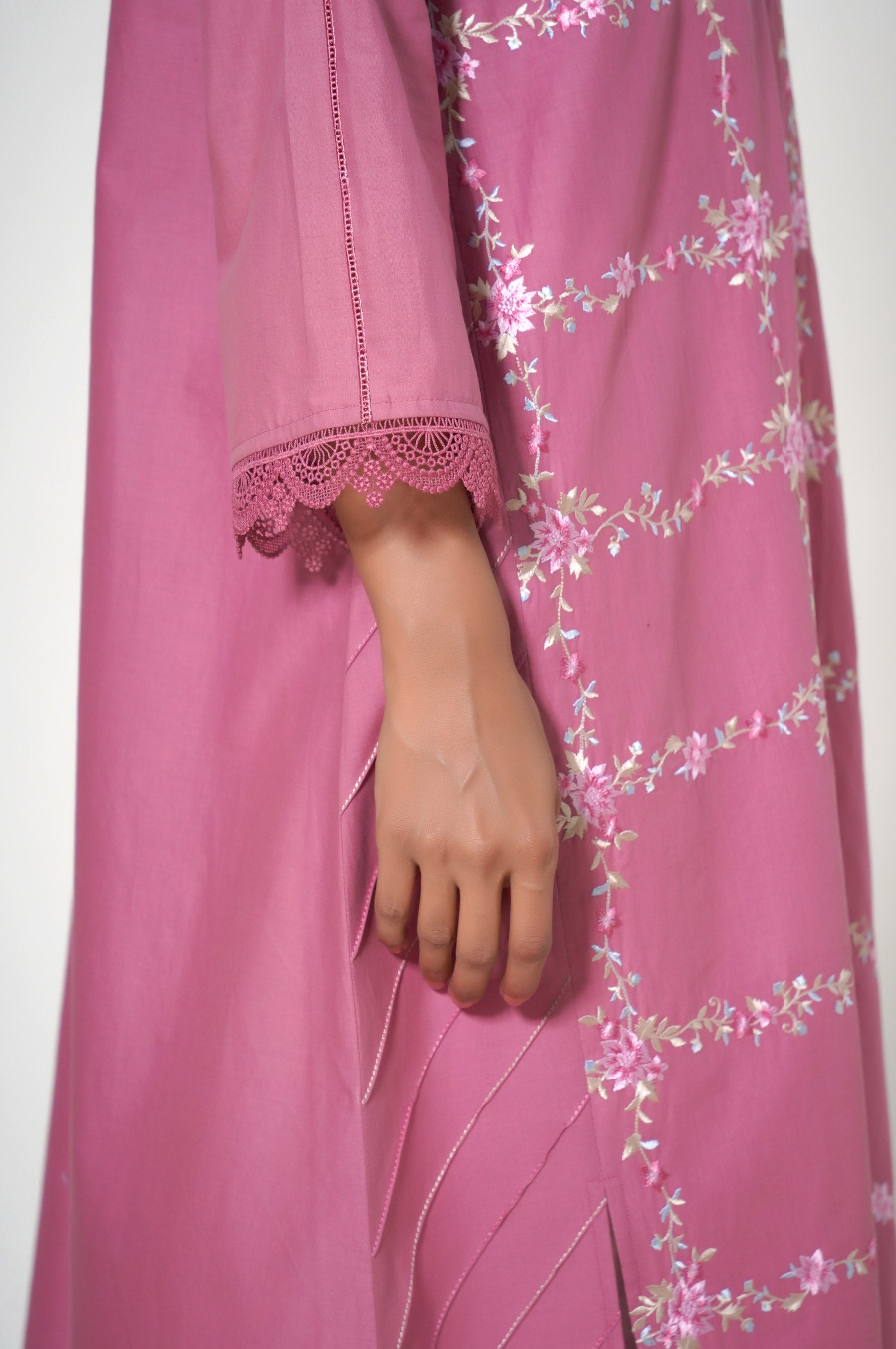 Lilac pink embroidered shirt designed beautifully with floral embroidery on front panel and side panels are stylized with diagonal colored stitch lines followed by pintux and lace on the neckline.