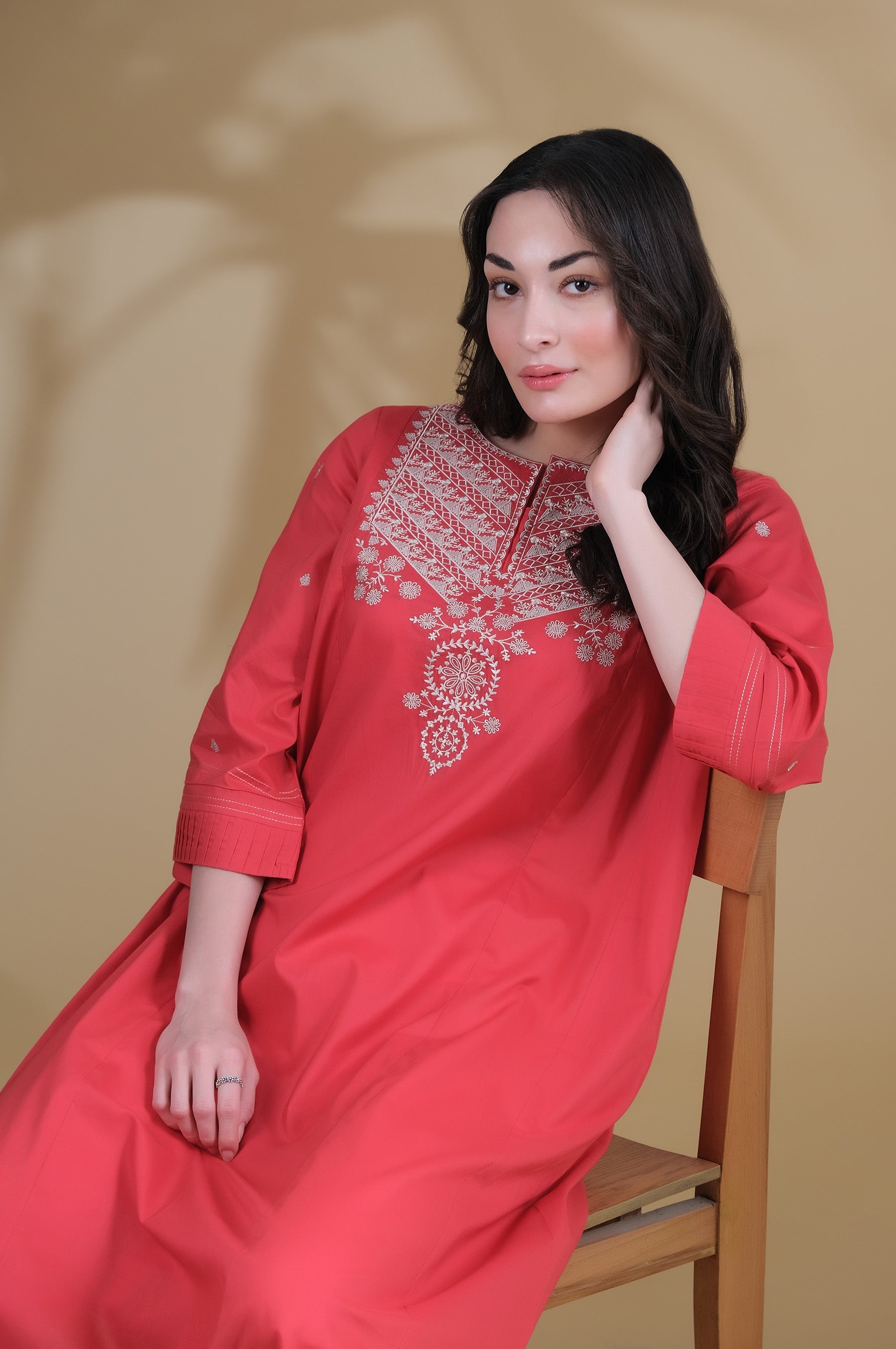 This crimson shirt designed beautifully with geometrical embroidery along the neckline with cute floral motifs on the sleeves. The outfit is enhanced by adding running stitches and pleats to the cuff. This casual shirt can be paired with our bottoms.