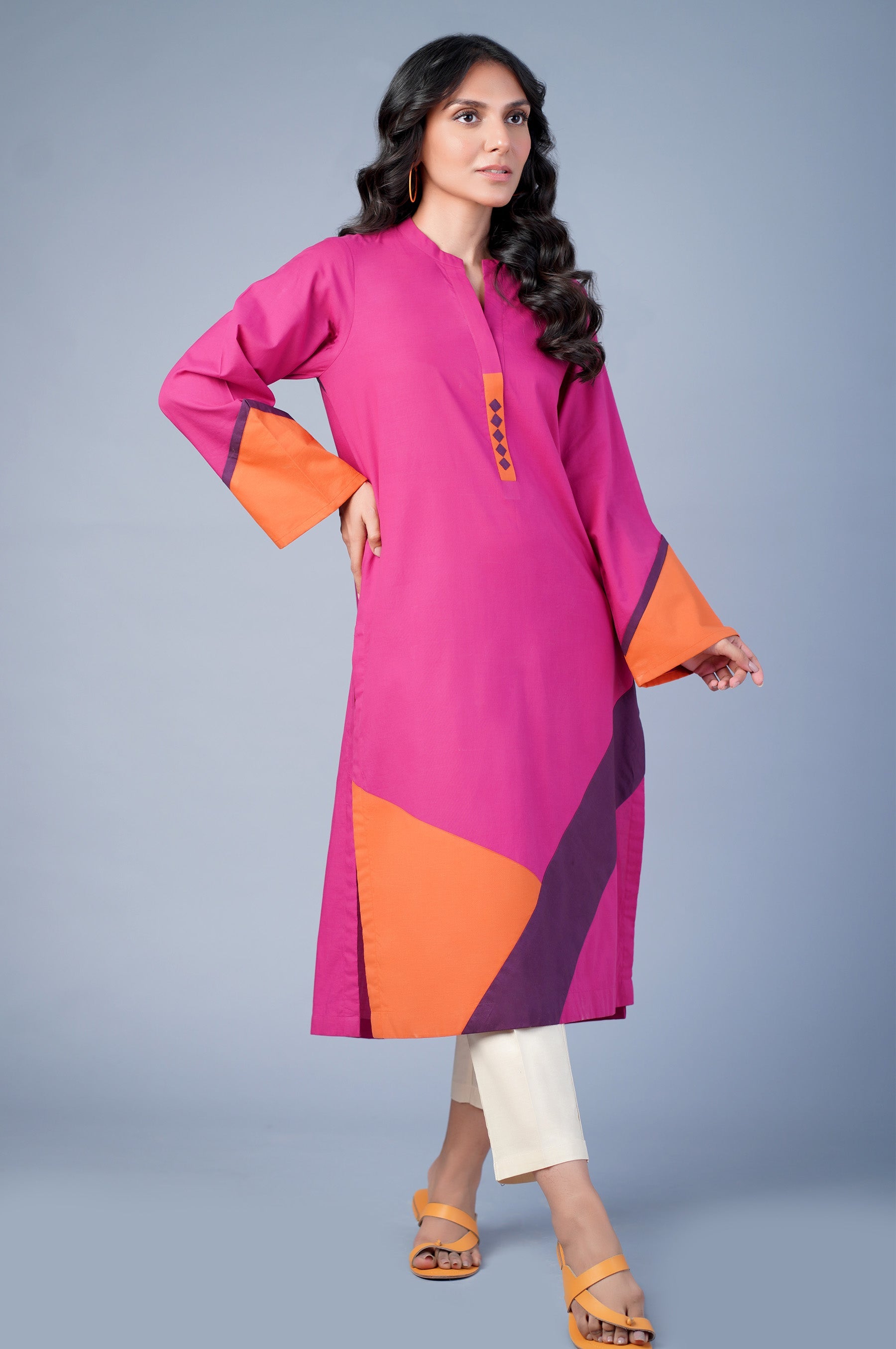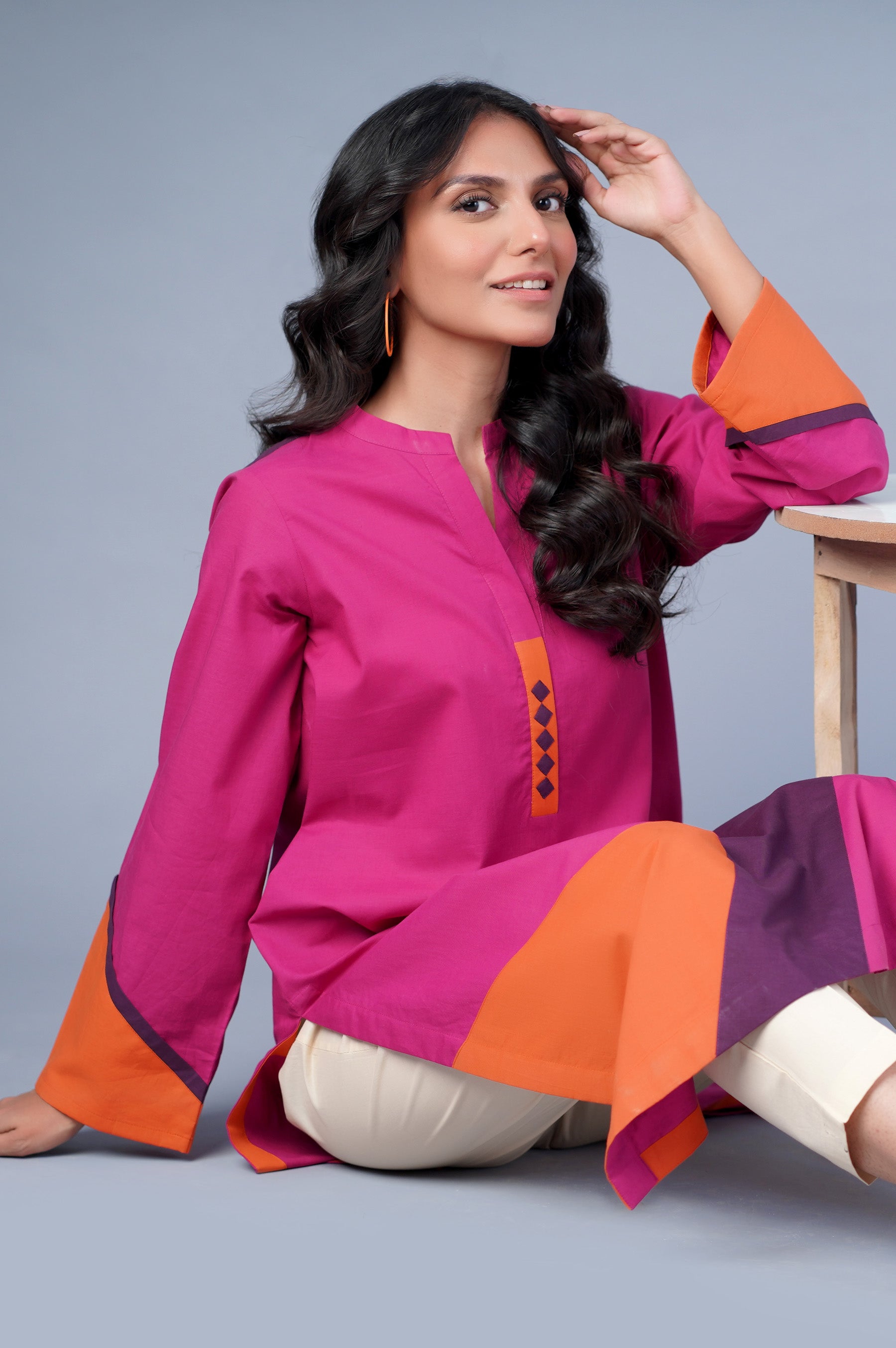This hot pink cambric shirt out fully stylized with color blocking detailing on the neck placket back hem. This bright canvas of colors is perfect to beat the heat and wear to anytime soiree. Pair up the look with our Zeen beige pants for an effortless look.