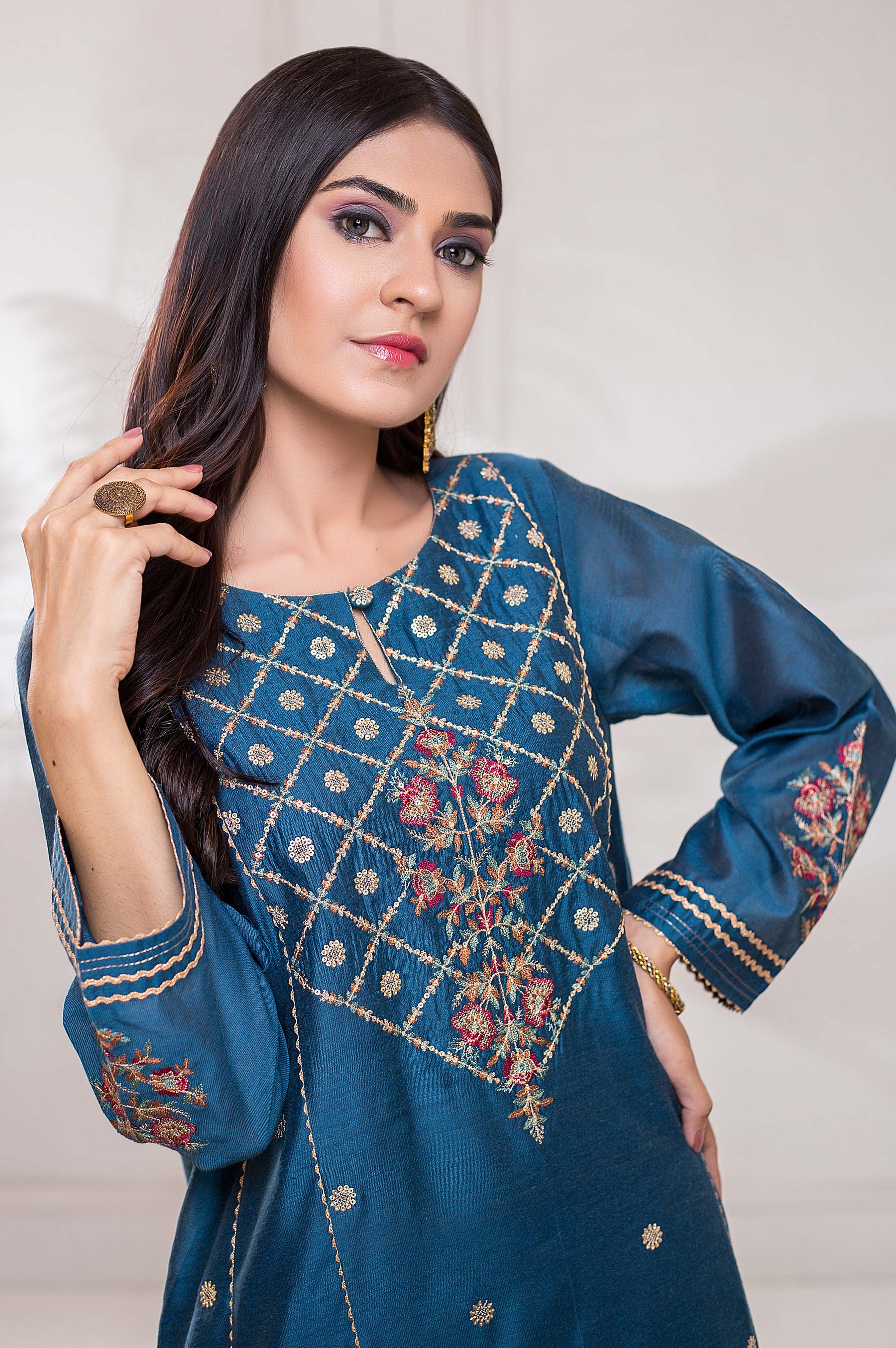 Cotton Net Embroidered Shirt, Front & Sleeves Embroidered.