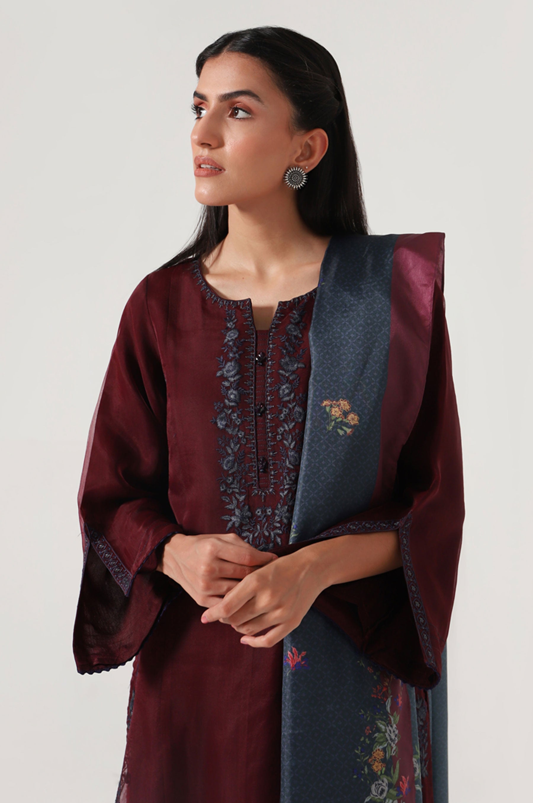 Make statement look this season with alluring floral embroidered neckline on organza and digital printed dupatta to finish the look.