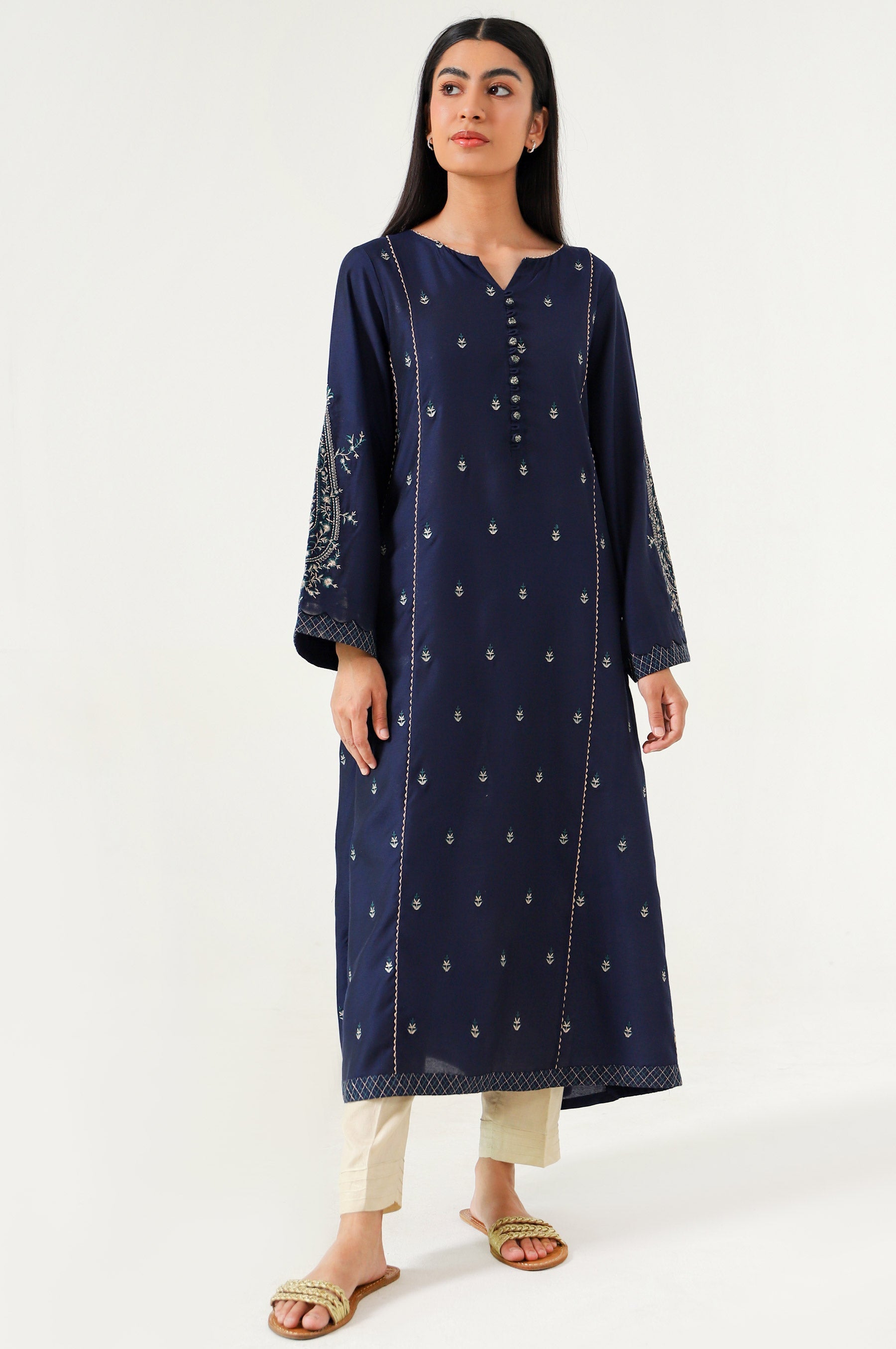 In a charming navy blue shade, this graceful cotton silk shirt is beautifully crafted in an elegantly voluminous pishwas silhouette and adorned with intricate embroidery at front and sleeves. This shirt is a pure sophistication to embrace at formal events.Pair this shirt with matching raw silk bottom from our zeen bottoms.