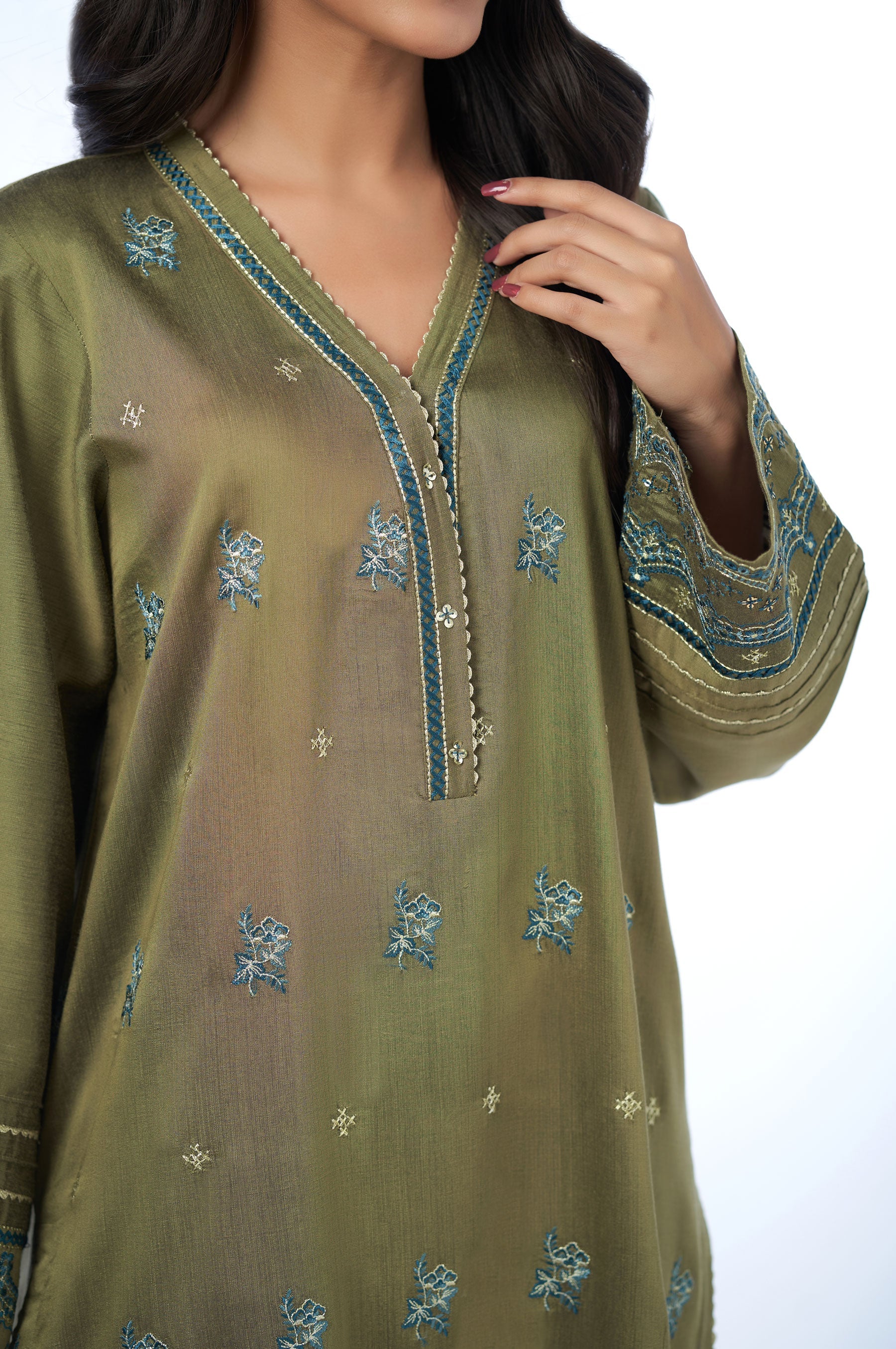 A majestic cotton silk 1Pc shirt giving vintage feel with embroidery at front and sleeves. This V-style neck design shirt is a versatile option for evenings gatherings. Pair this shirt with matching golden raw silk bottom from our zeen bottoms.